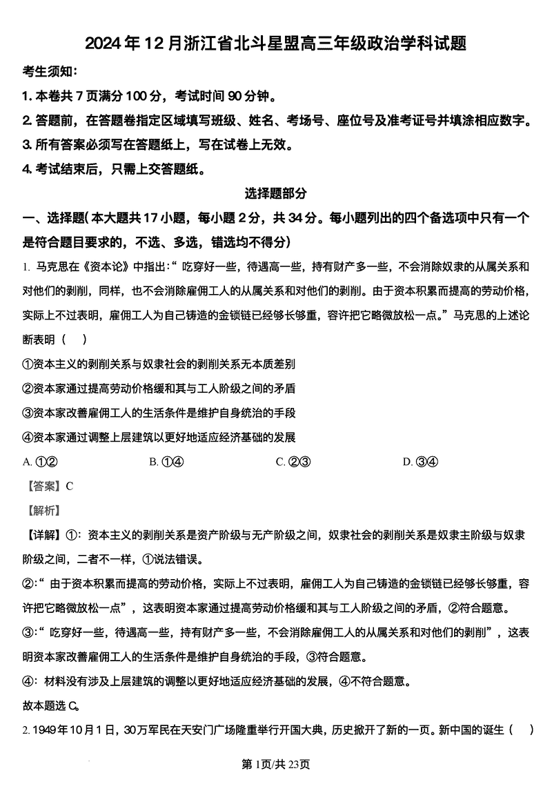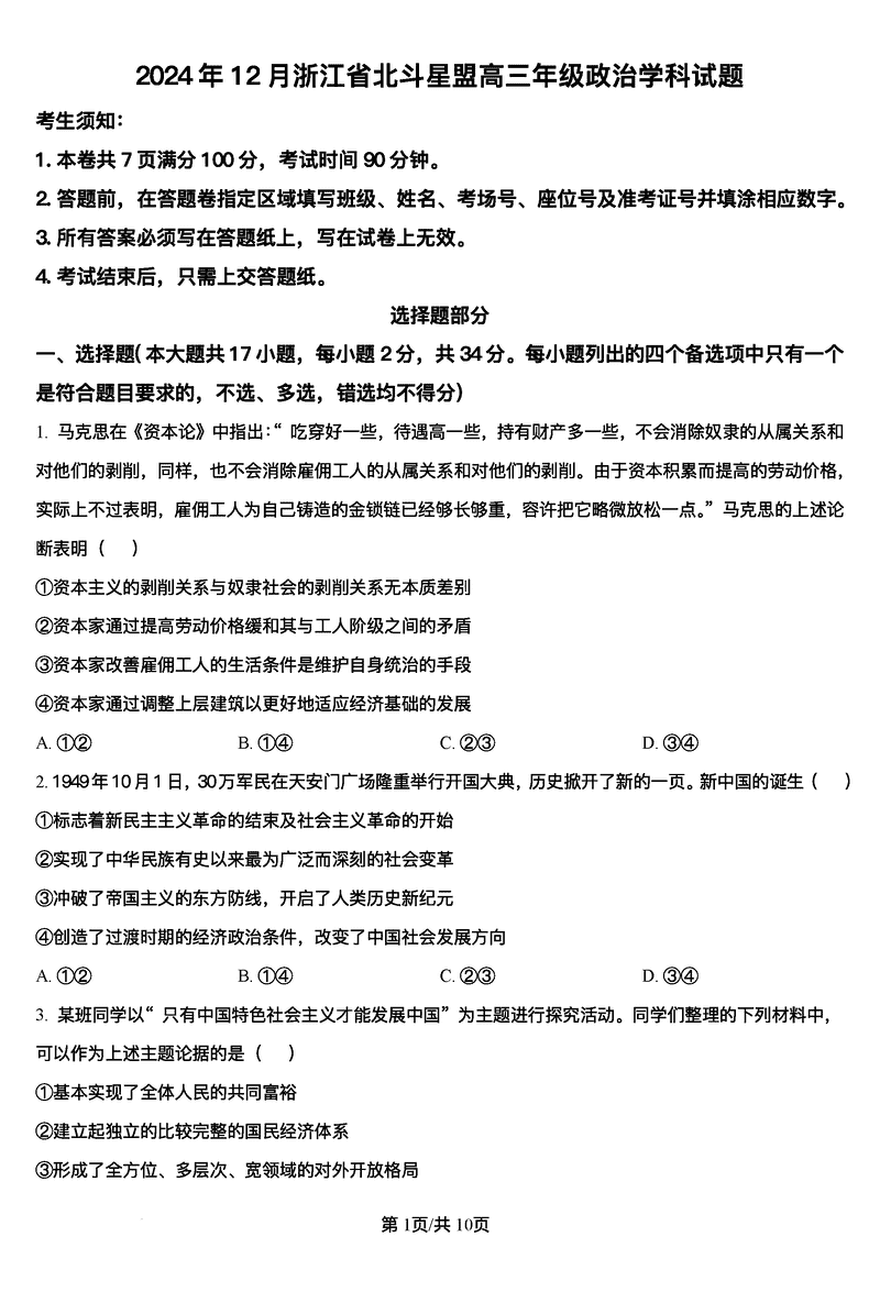 浙江北斗星盟2024年高三上学期12月月考政治考试已于近日开考,为方便考生考后及时查看考试情况,查漏补缺、弥补不足,本文整理了试题答案解析相关信息!