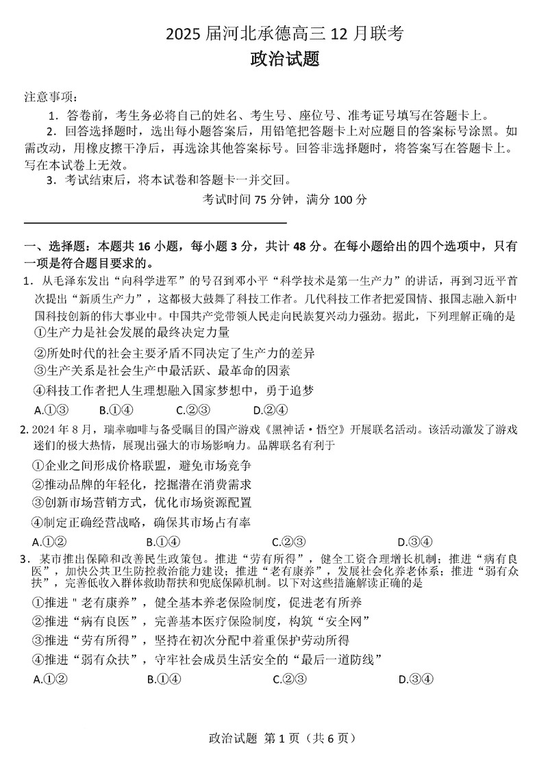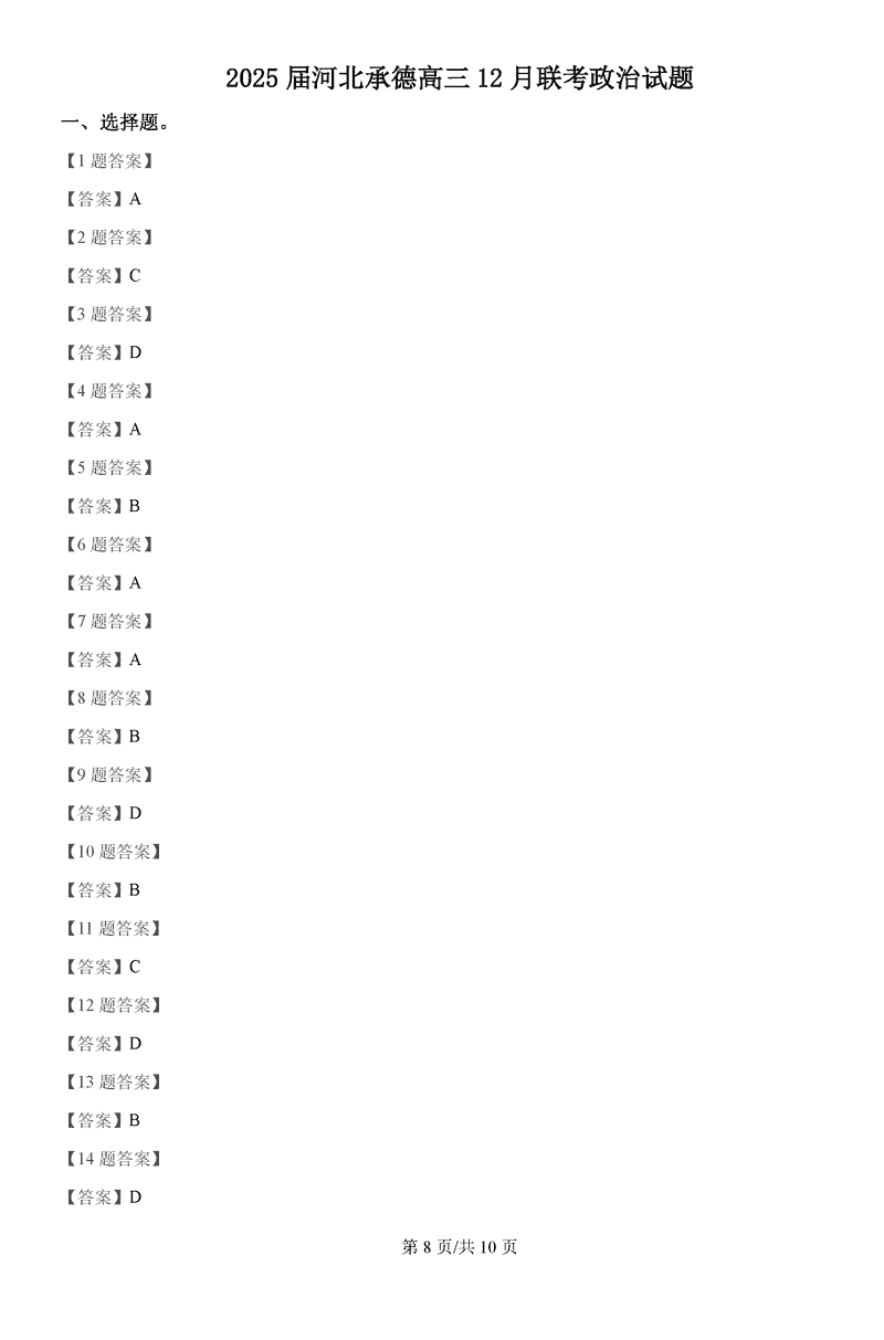 河北承德2025届高三上学期12月联考政治试题及答案 时间:2024-12-30 河北 文综试题 浙江北斗星盟2024年高三上学期12月月考政治考试已于近日开考,为方便考生考后及时查看考试情况,查漏补缺、弥补不足,本文整理了试题答案解析相关信息! 汇总:河北承德2025届高三上学期12月联考试题及答案汇总 政治试题及答案解析