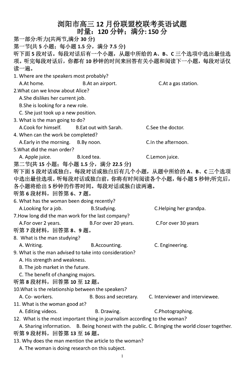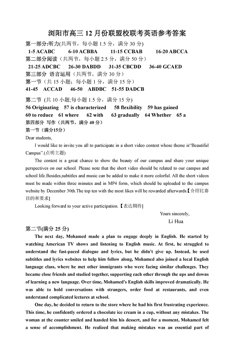湖南浏阳市联盟校2024-2025学年高三上学期12月联考英语考试已于近日开考,为方便考生考后及时查看考试情况,查漏补缺、弥补不足,本文整理了试题答案解析相关信息!