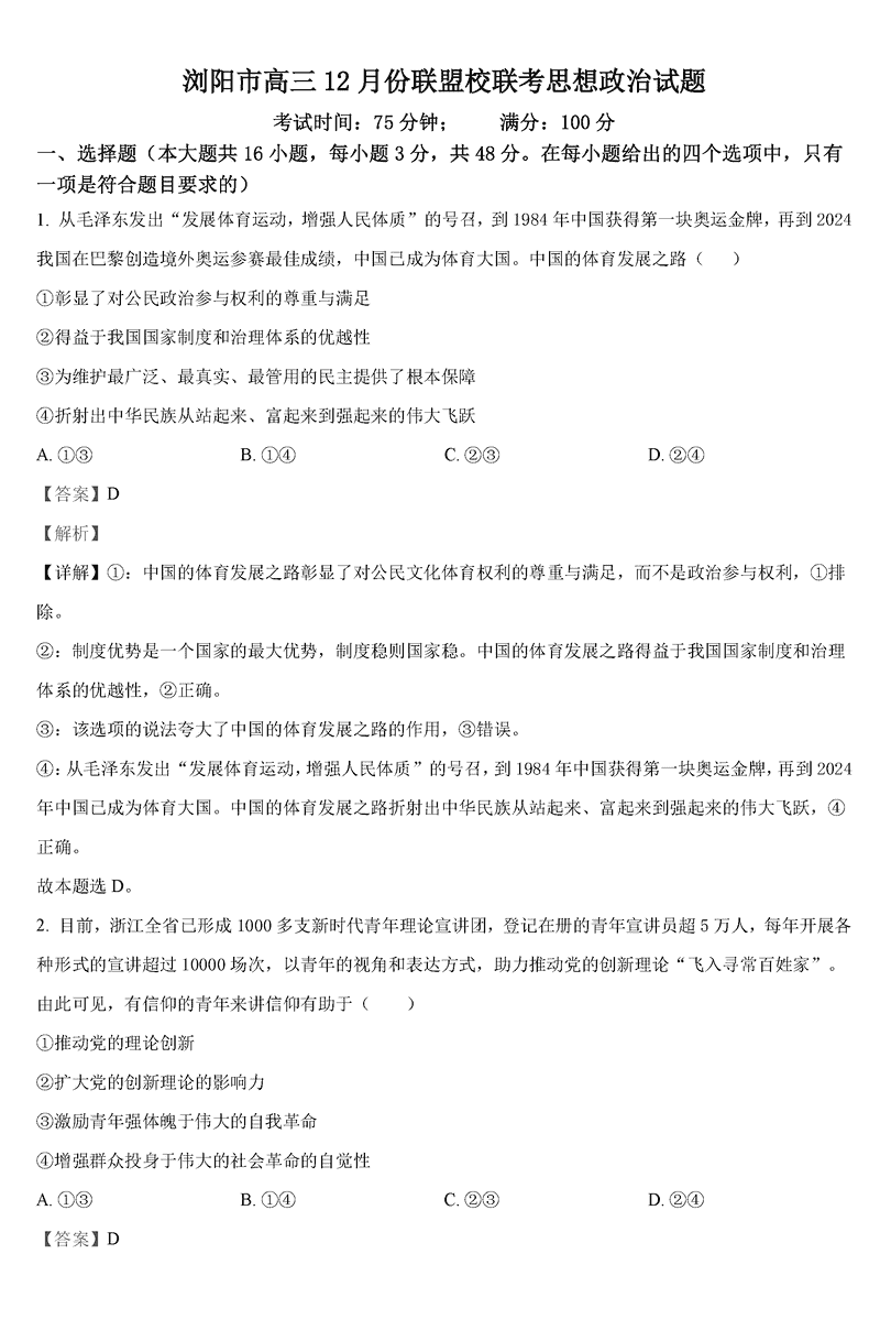湖南浏阳市联盟校2024-2025学年高三上学期12月联考政治考试已于近日开考,为方便考生考后及时查看考试情况,查漏补缺、弥补不足,本文整理了试题答案解析相关信息!