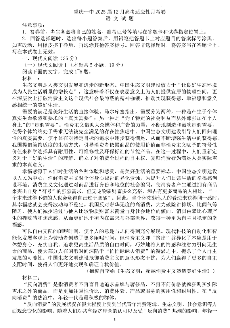 重庆一中2025届高三上学期12月月考语文试题及答案 时间:2025-01-03 重庆 语文试题 重庆一中2025届高三上学期12月月考语文考试已于近日开考,为方便考生考后及时查看考试情况,查漏补缺、弥补不足,本文整理了试题答案解析相关信息! 汇总:重庆一中2025届高三上学期12月月考试题及答案汇总 语文试题及答案解析