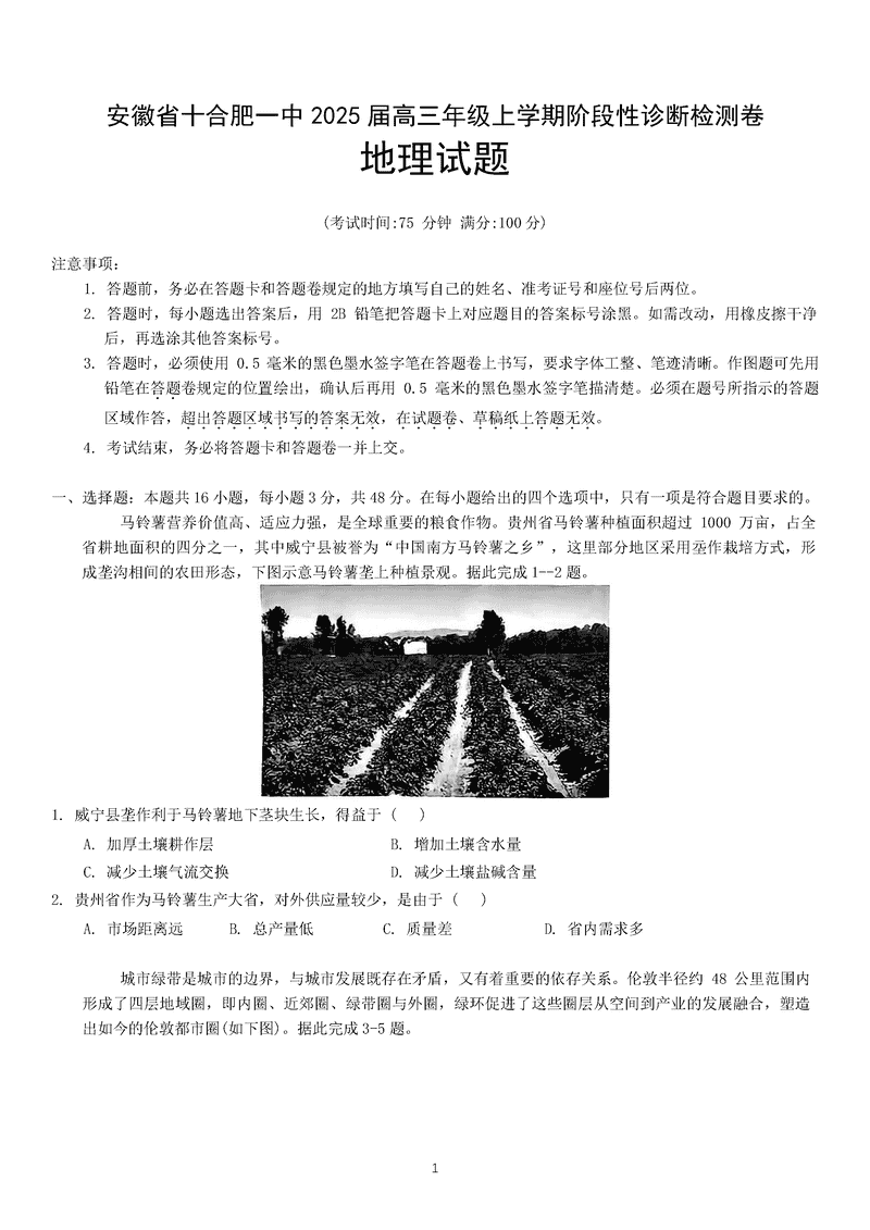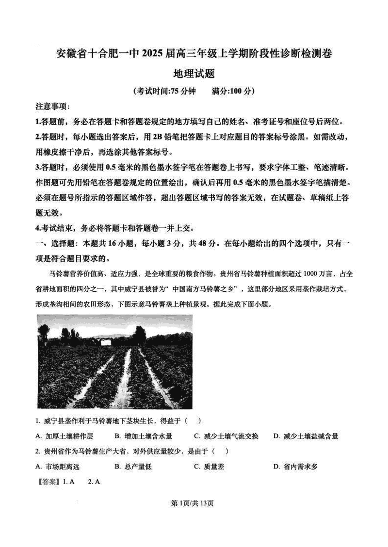 安徽省十联考合肥一中2025届高三上学期阶段性诊断检测地理考试已于近日开考,为方便考生考后及时查看考试情况,查漏补缺、弥补不足,本文整理了试题答案解析相关信息!