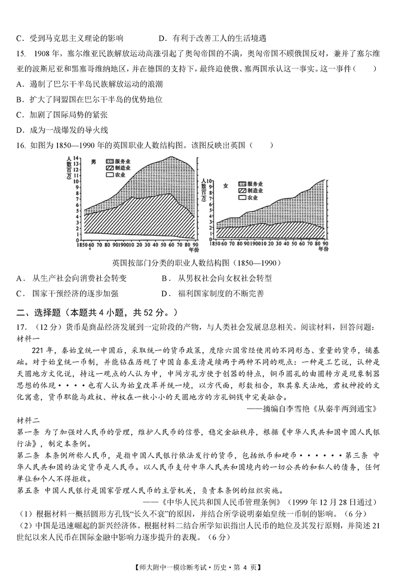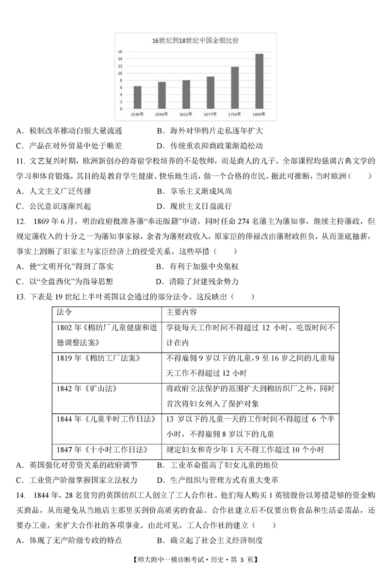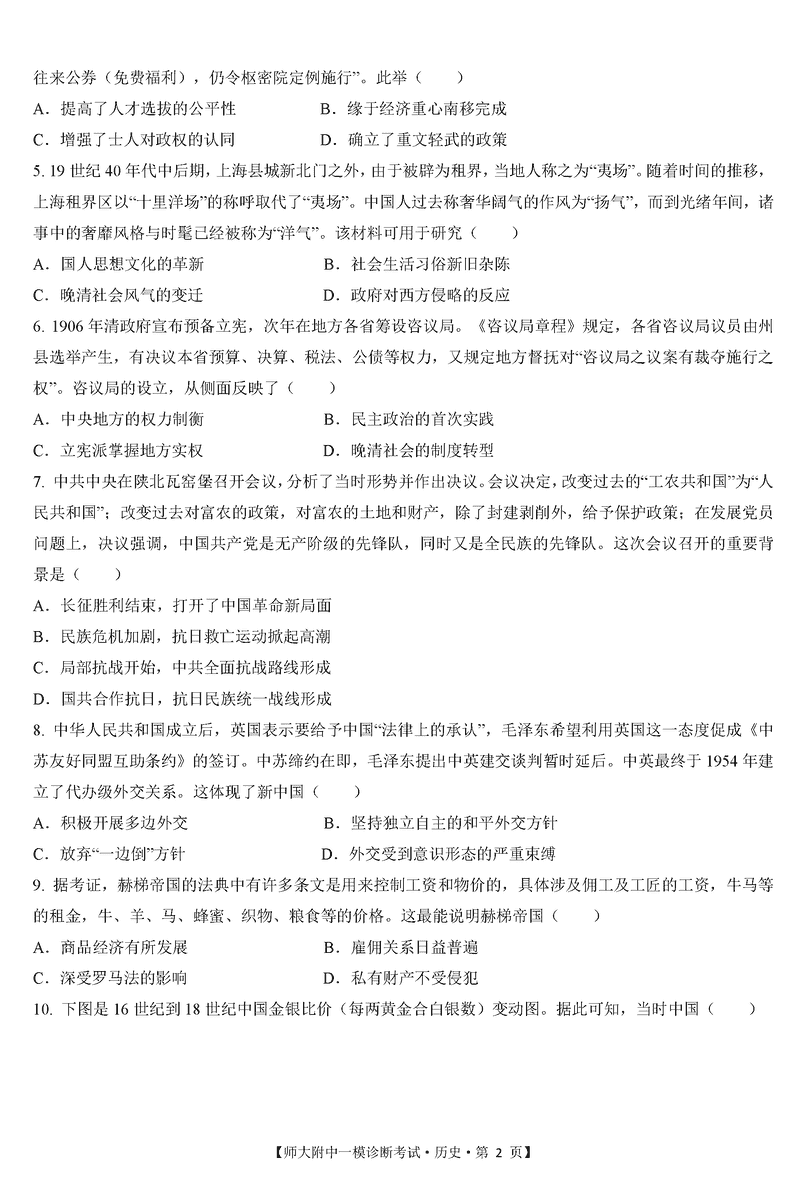 甘肃西北师大附中2025届高三上学期一模历史试题及答案