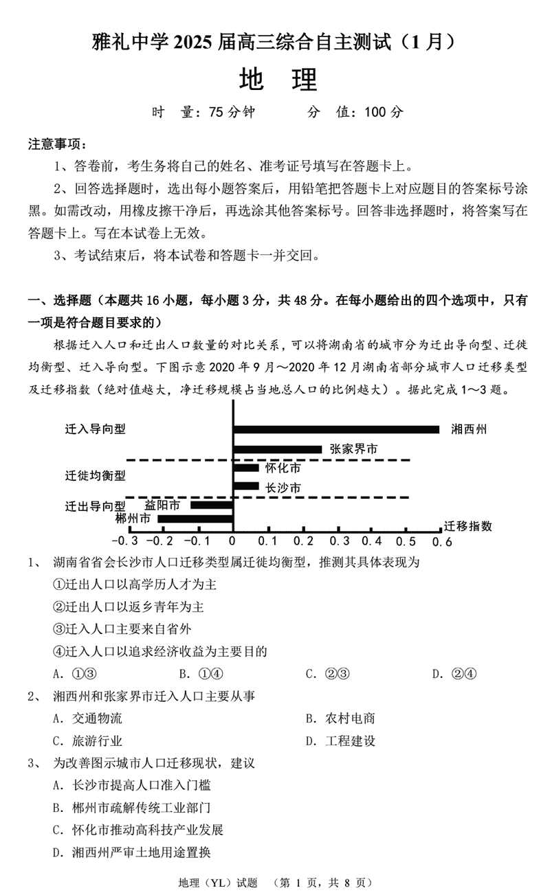 湖南雅礼中学2025届高三上学期1月期末综合自主测试地理试题及答案