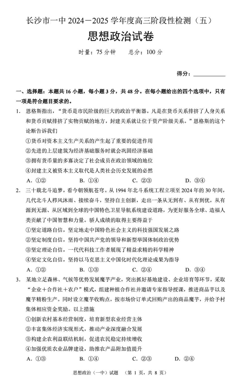 湖南长沙一中2025届高三上学期阶段性检测(五)政治试题及答案