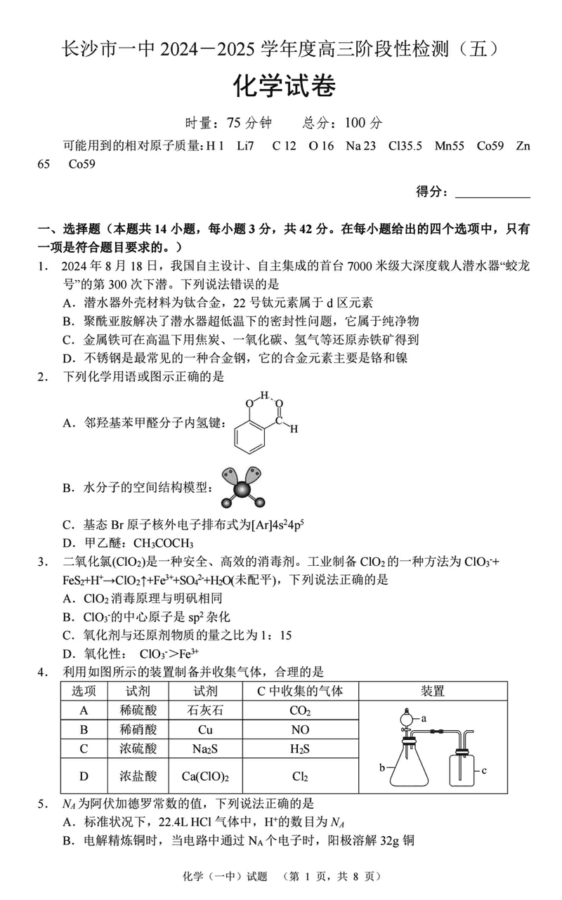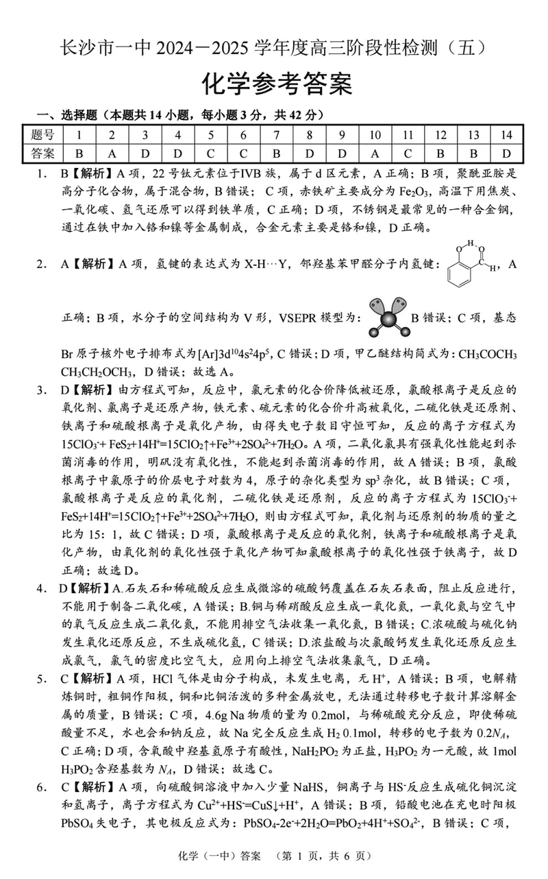 湖南长沙一中2025届高三上学期阶段性检测(五)化学考试已于近日开考,为方便考生考后及时查看考试情况,查漏补缺、弥补不足,本文整理了试题答案解析相关信息!