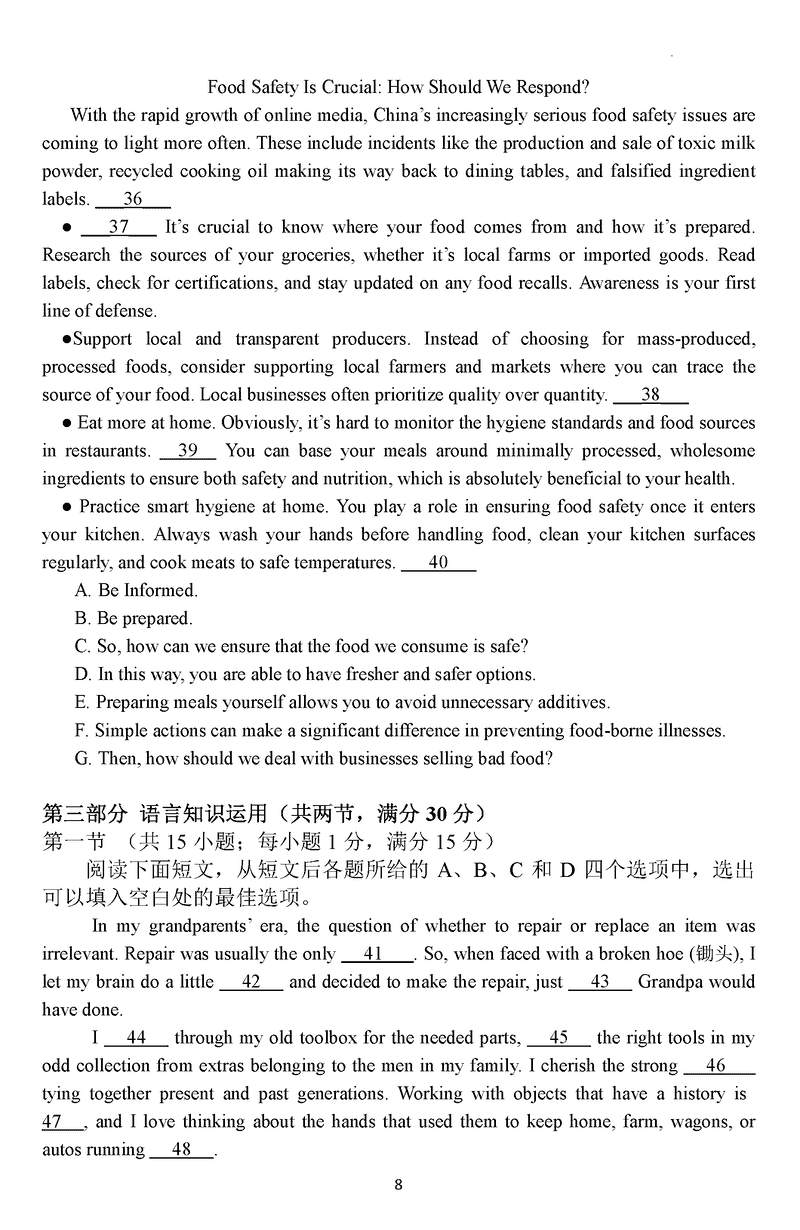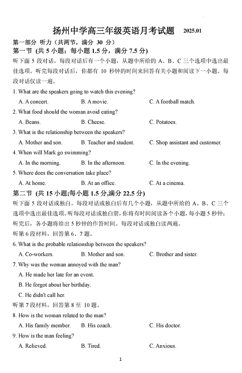 江苏扬州中学2025届高三上学期1月自主评估英语试题及答案