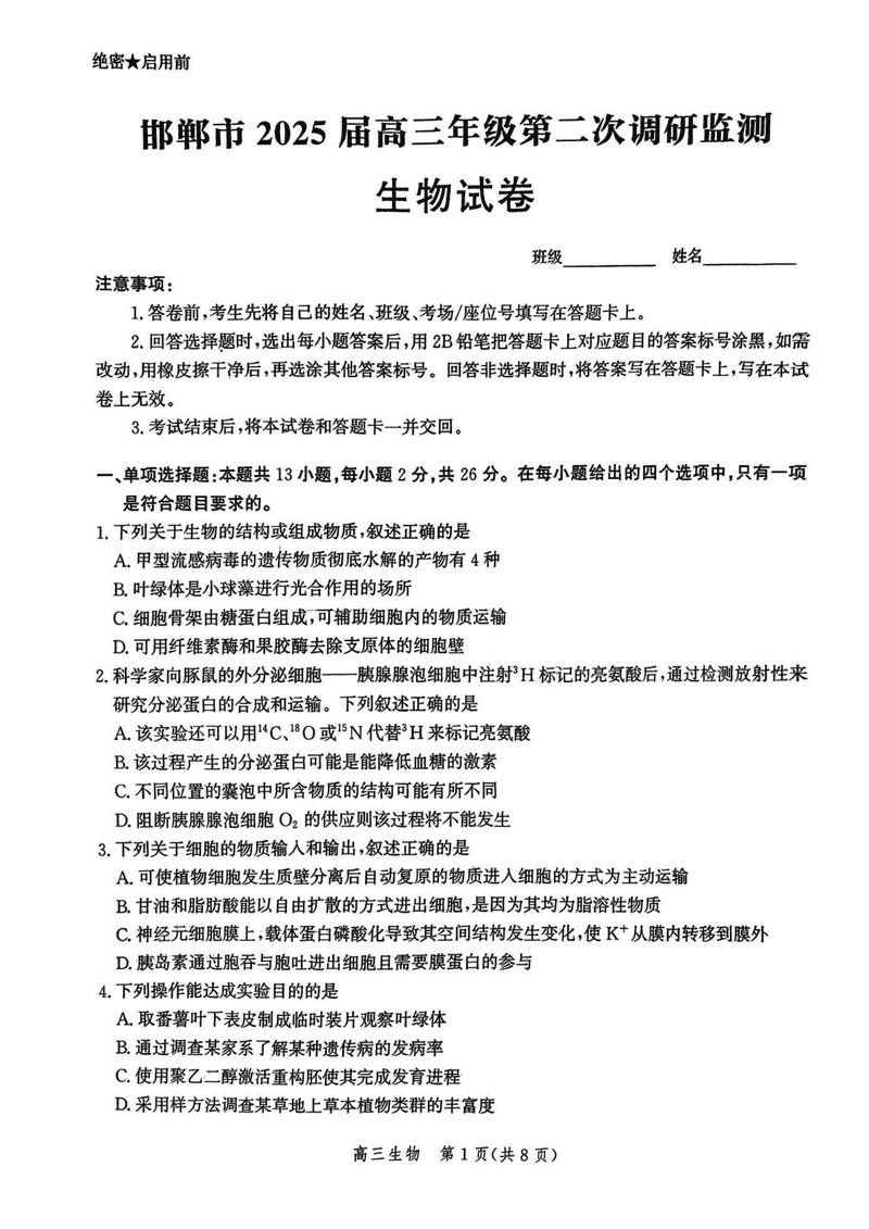 河北邯郸2025届高三上学期第二次调研监测生物试题及答案