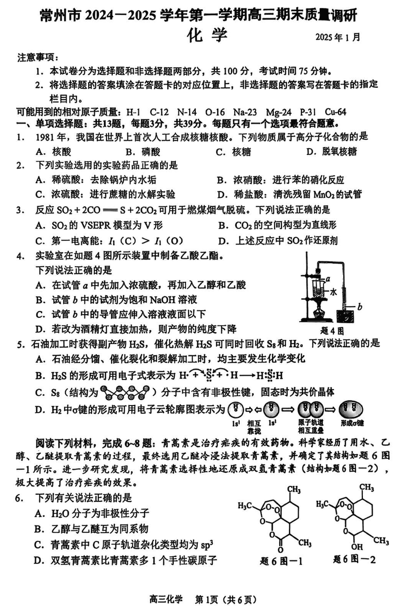 常州市2024-2025学年高三上学期期末化学试题及答案