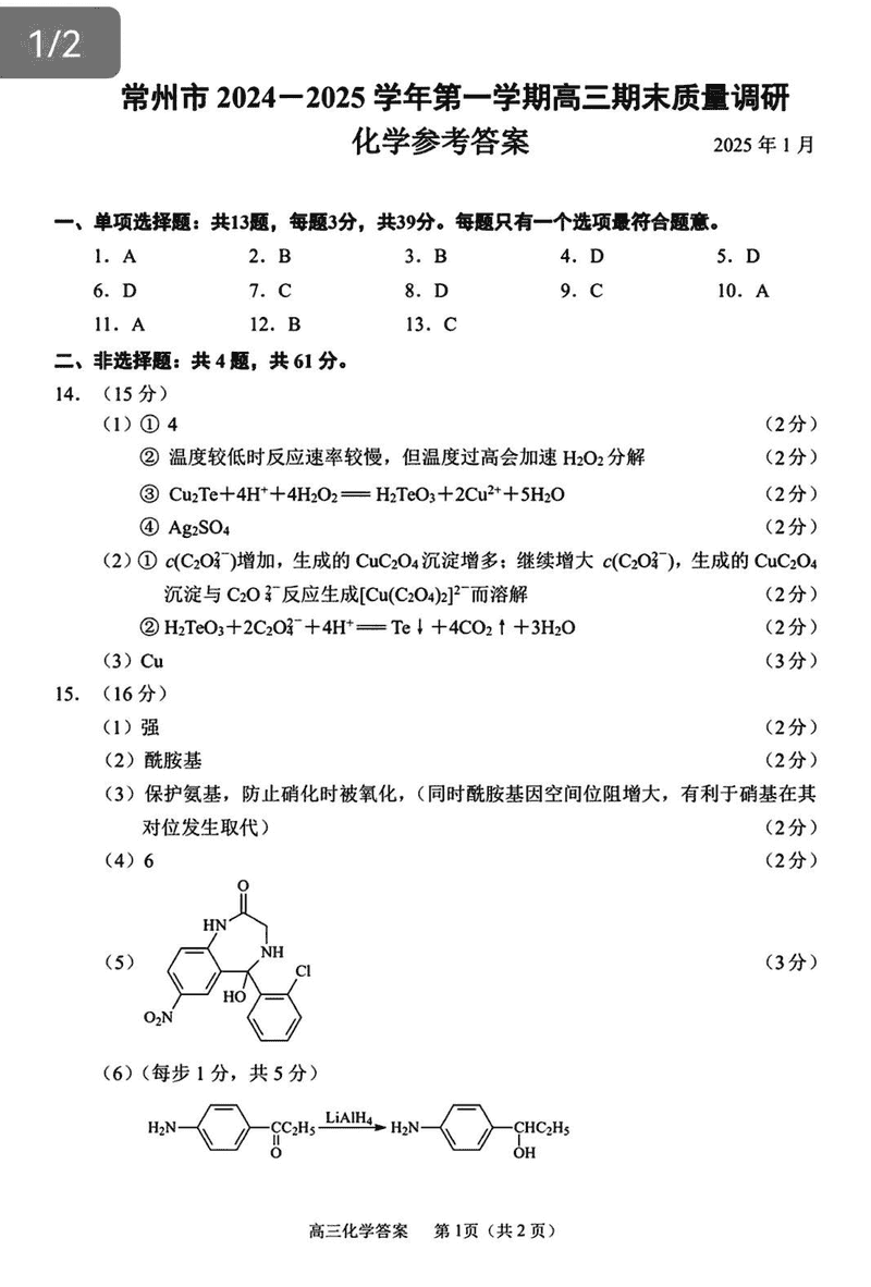 江苏省常州市2024-2025学年高三上学期期末化学考试已于近日开考,为方便考生考后及时查看考试情况,查漏补缺、弥补不足,本文整理了试题答案解析相关信息!
