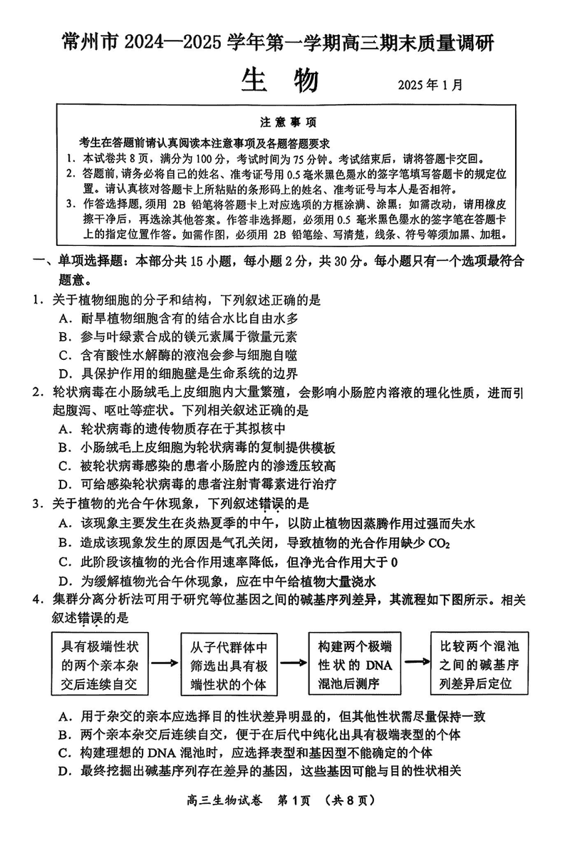 常州市2024-2025学年高三上学期期末生物试题及答案
