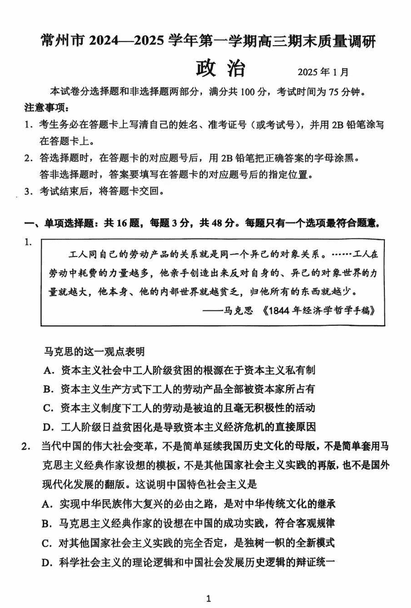 常州市2024-2025学年高三上学期期末政治试题及答案
