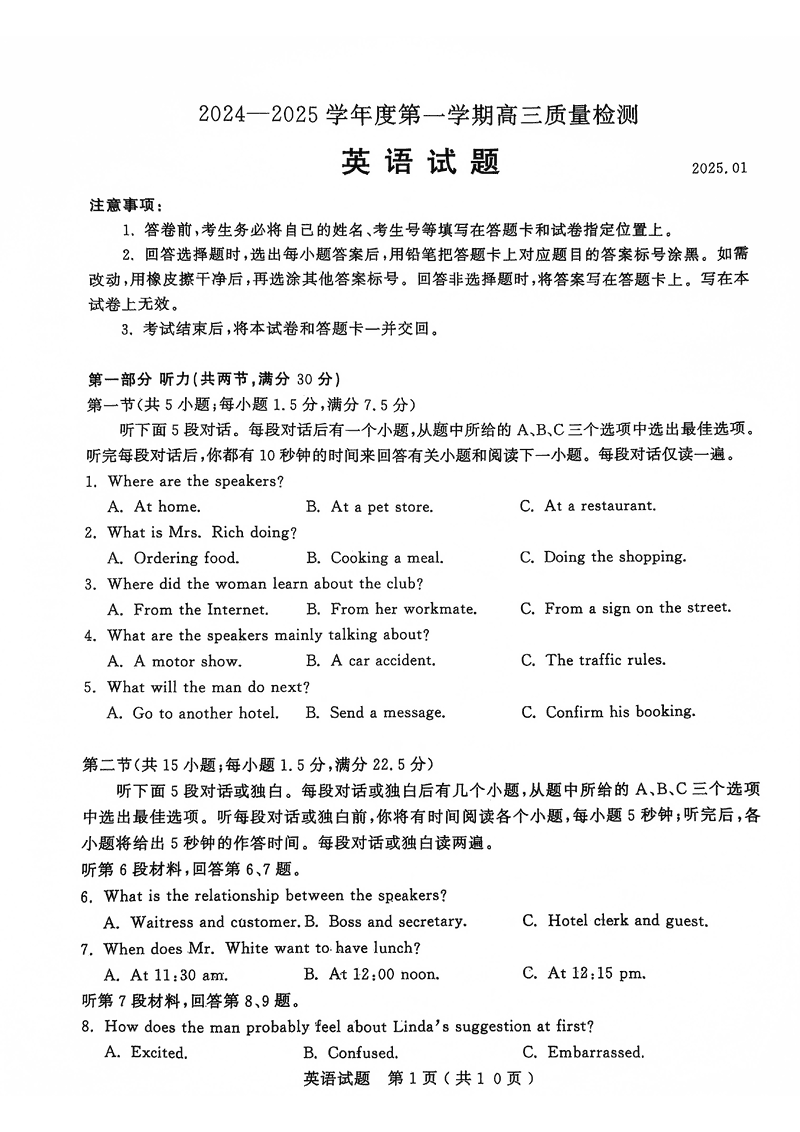 济宁2024-2025学年高三上学期1月期末英语试题及答案