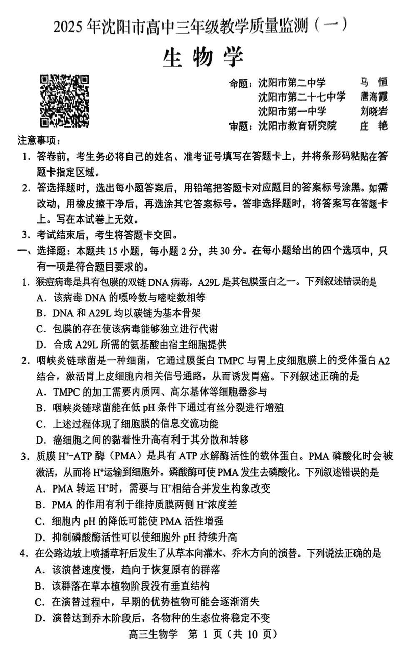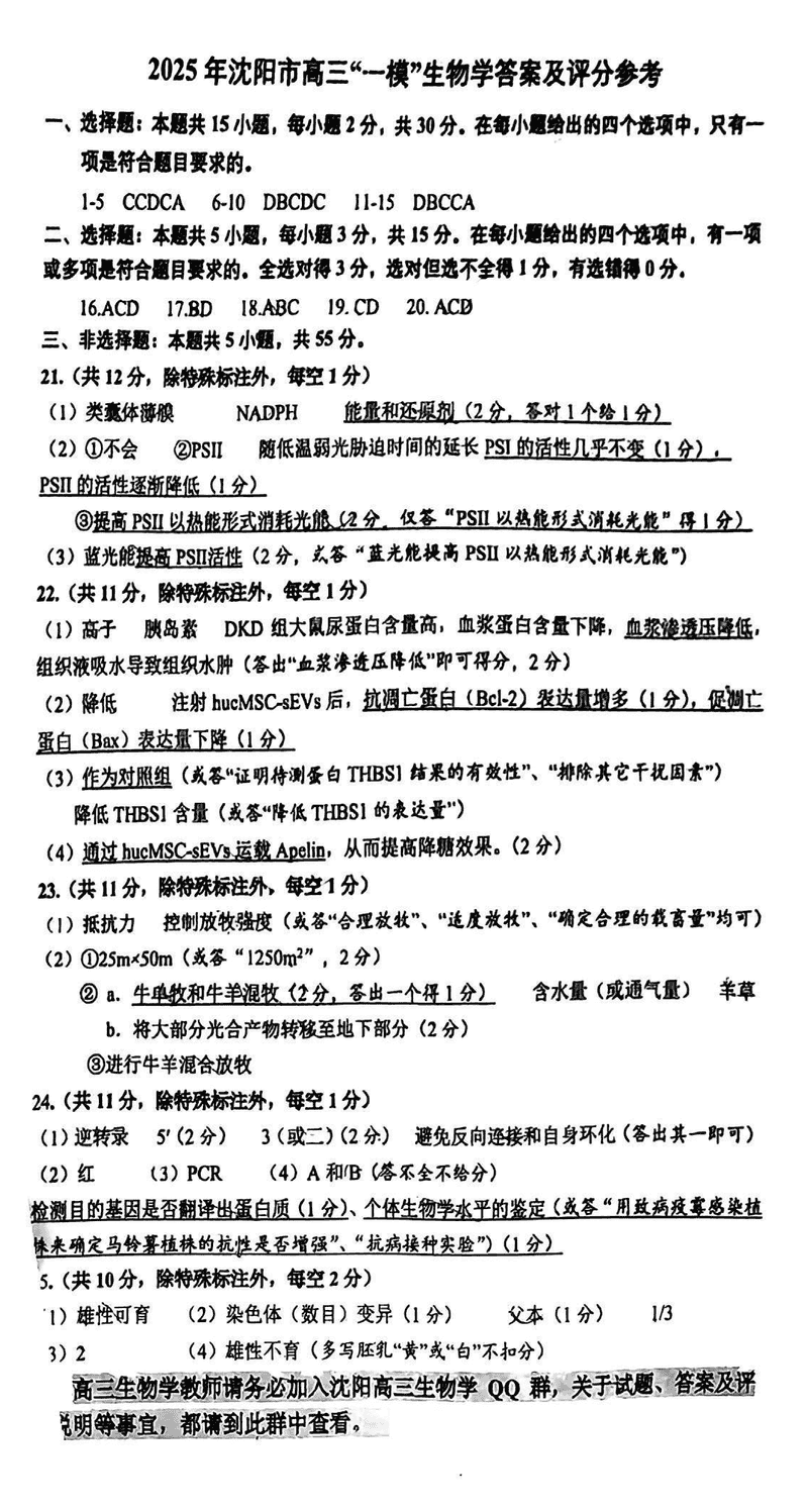 沈阳2025届高三上学期教学质量监测(一)生物考试已于近日开考,为方便考生考后及时查看考试情况,查漏补缺、弥补不足,本文整理了试题答案解析相关信息!