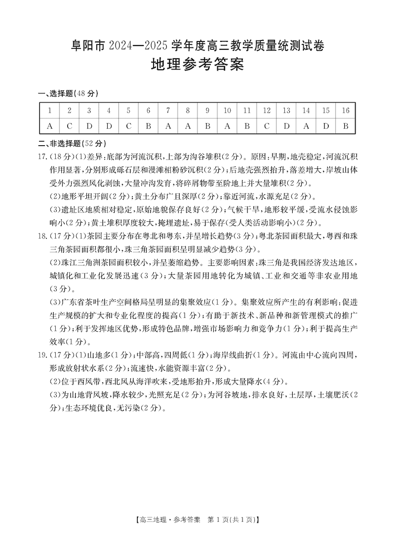 安徽省阜阳市2025届高三上学期教学质量统测地理考试已于近日开考,为方便考生考后及时查看考试情况,查漏补缺、弥补不足,本文整理了试题答案解析相关信息!
