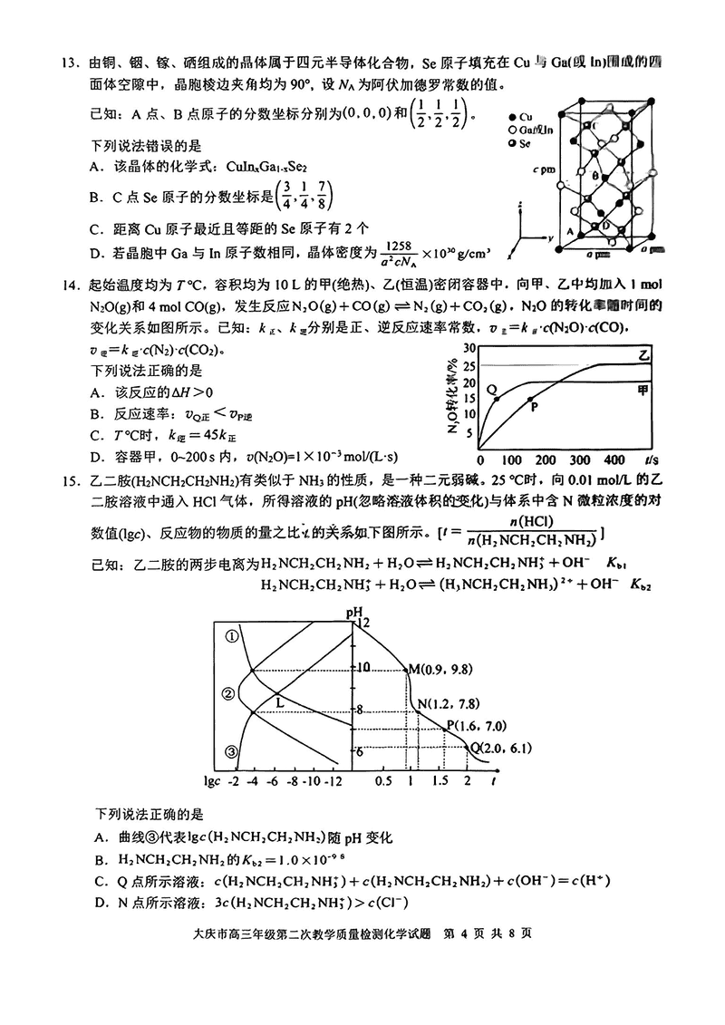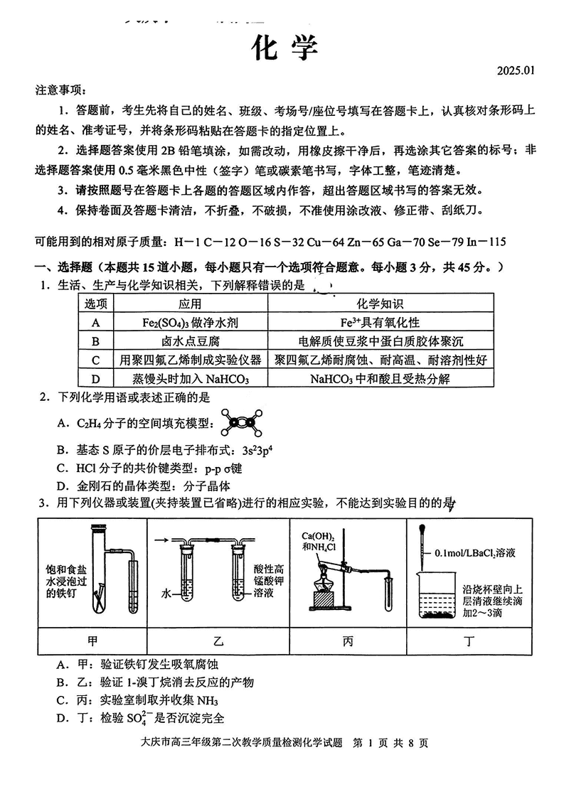 大庆二模2025届高三年级第二次教学质检化学试题及答案