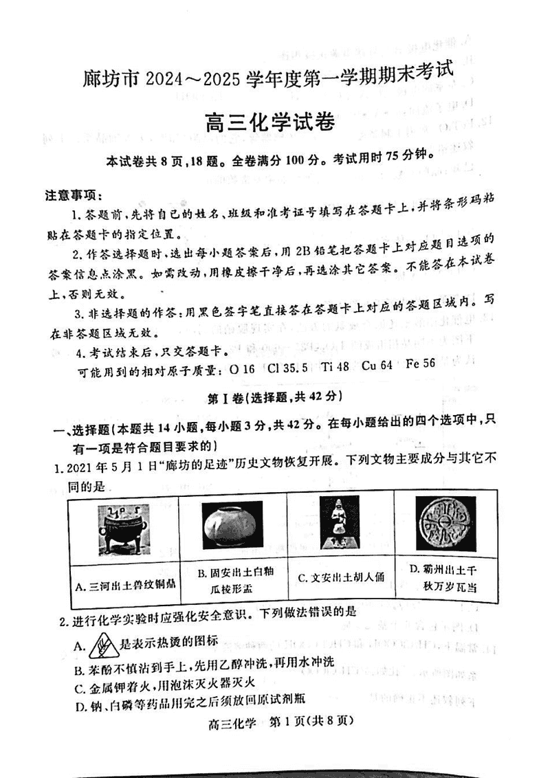 河北廊坊2025届高三上学期1月期末化学试题及答案