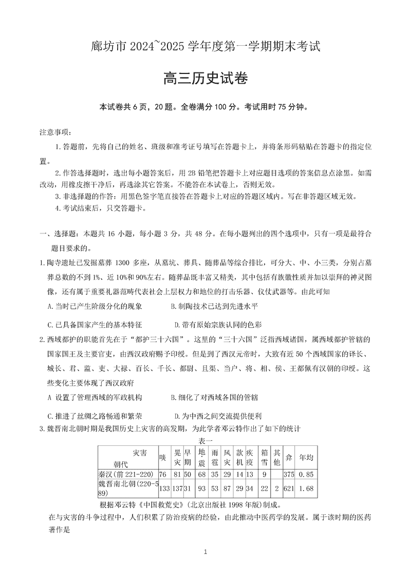 河北廊坊2025届高三上学期1月期末历史试题及答案