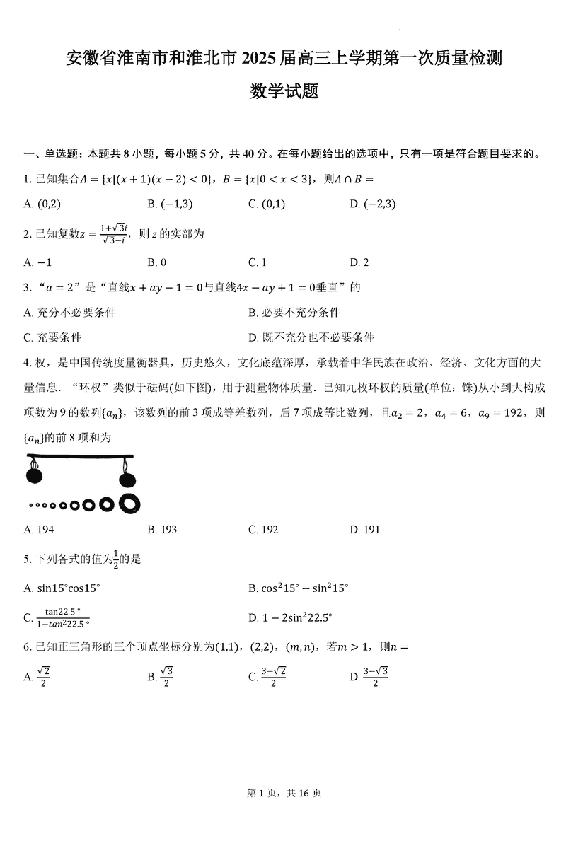 汇总:淮南市、淮北市2025届高三上学期第一次质量检测试题及答案汇总