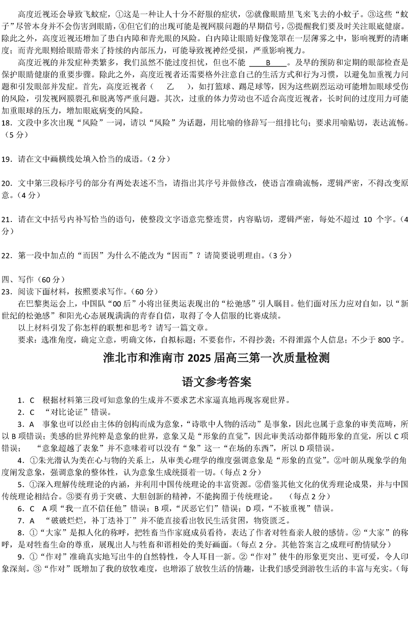 淮南市、淮北市2025届高三上学期第一次质检语文考试已于近日开考,为方便考生考后及时查看考试情况,查漏补缺、弥补不足,本文整理了试题答案解析相关信息!