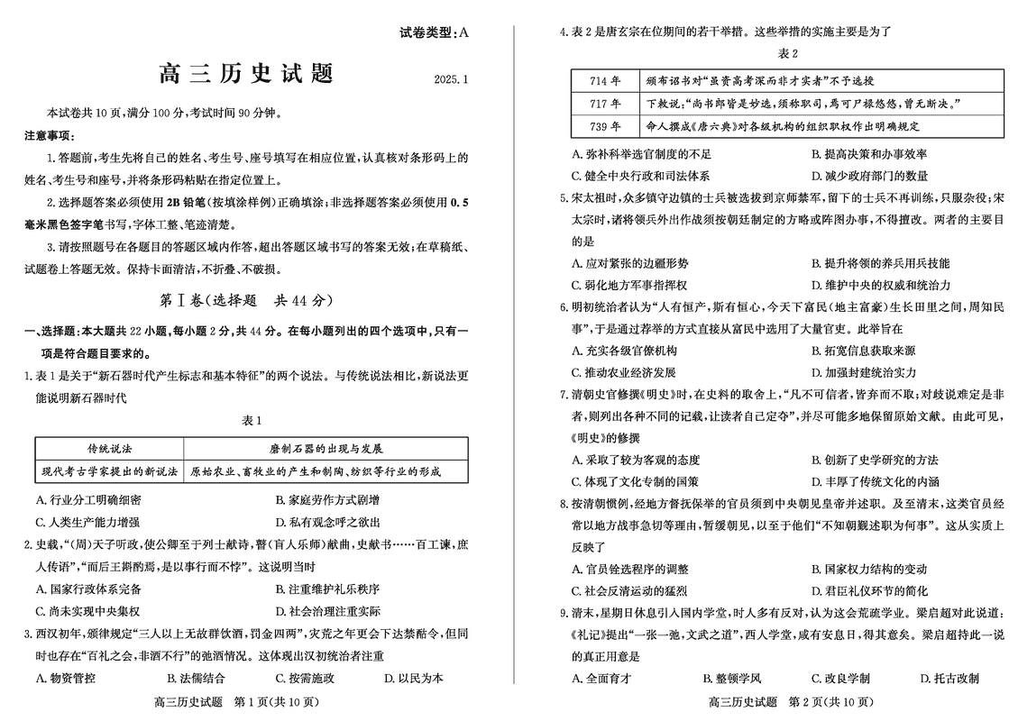 山东滨州2025年高三上学期1月期末历史试题及答案