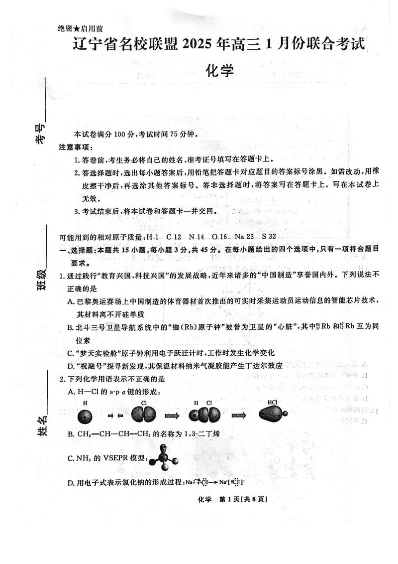 辽宁名校联盟2025年高三上学期1月联考化学试题及答案