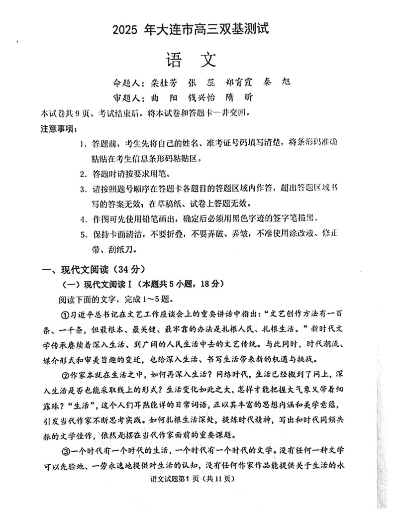 大连市2024-2025学年高三1月期末双基测试语文考试已于近日开考,为方便考生考后及时查看考试情况,查漏补缺、弥补不足,本文整理了试题答案解析相关信息!
