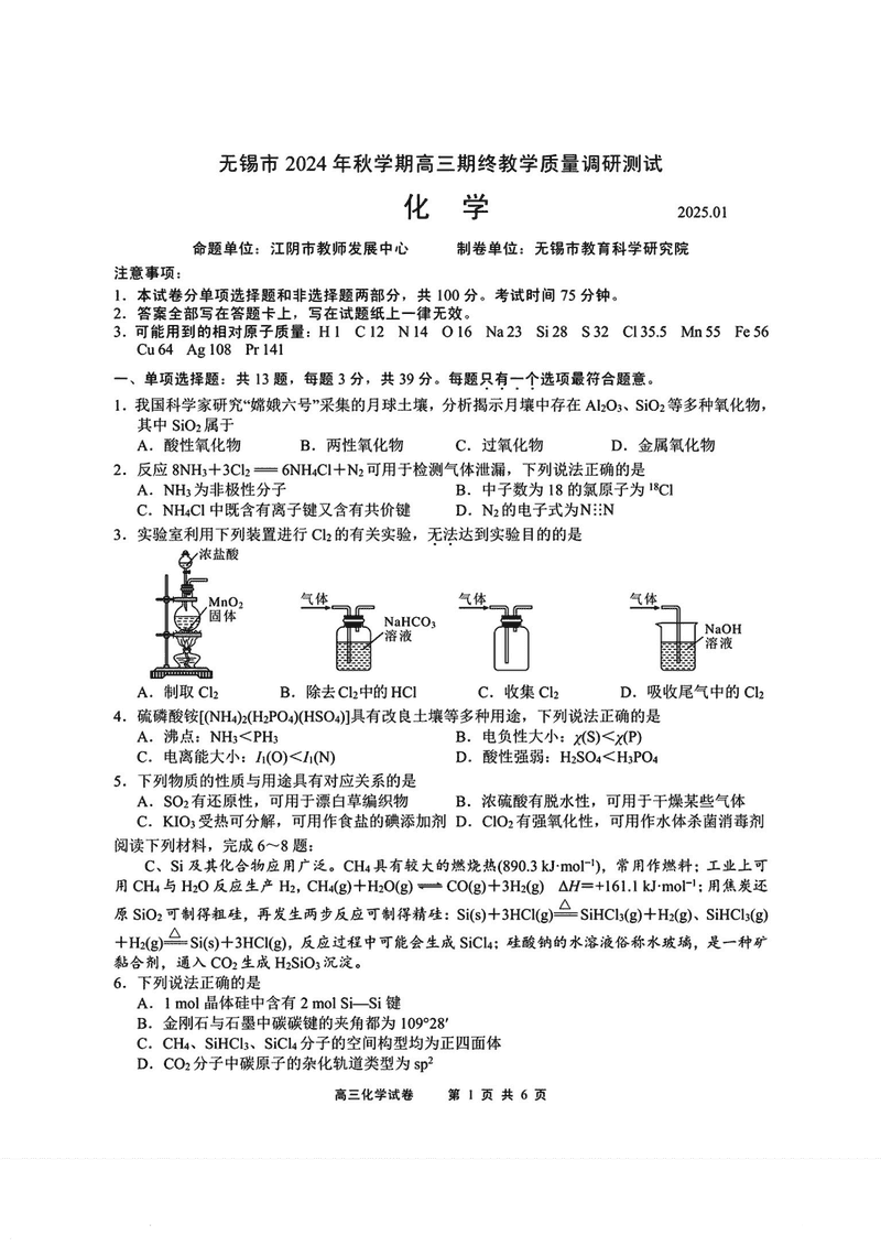 江苏无锡2025届高三期终教学质量调研化学试题及答案 时间:2025-01-17 江苏 理综试题 江苏无锡2025届高三期终教学质量调研化学考试已于近日开考,为方便考生考后及时查看考试情况,查漏补缺、弥补不足,本文整理了试题答案解析相关信息! 汇总:江苏无锡2025届高三期终教学质量调研试题及答案汇总 化学试题及答案解析