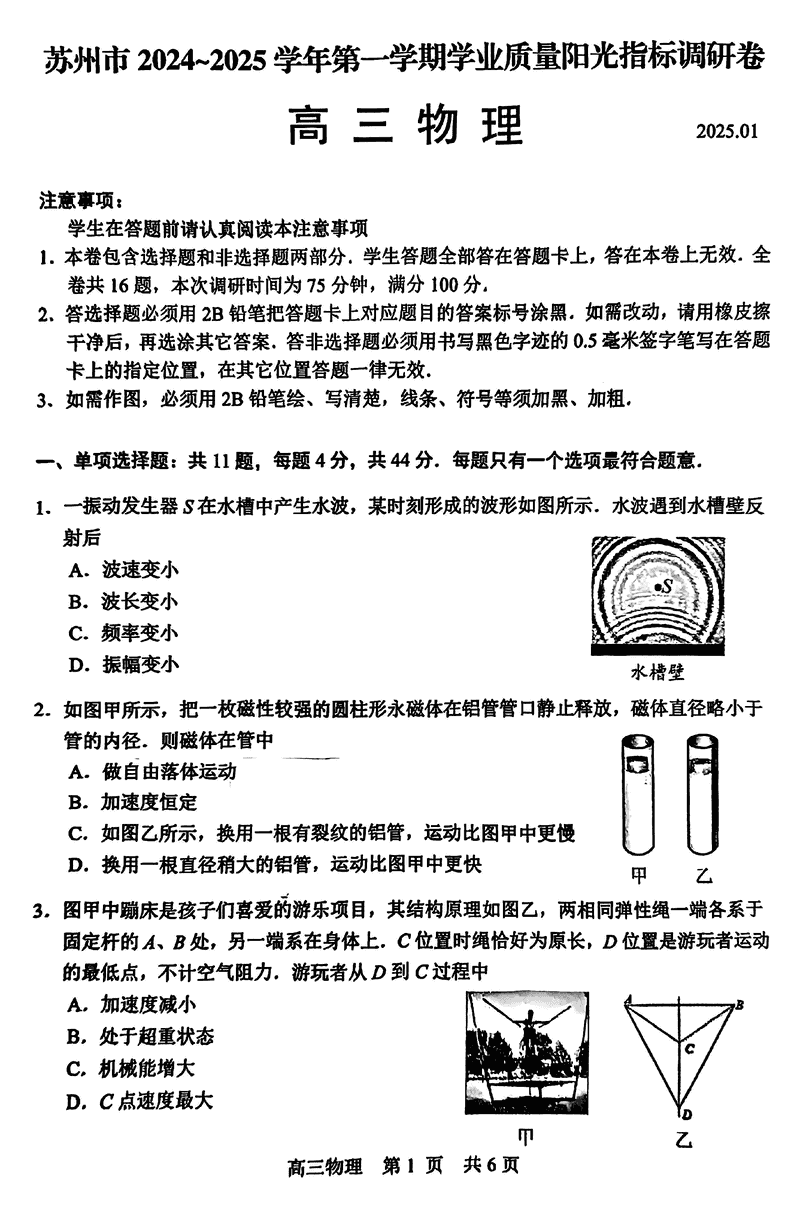 江苏苏州2025学年高三上学期1月期末物理试题及答案 时间:2025-01-18 江苏 理综试题 江苏苏州2025学年高三上学期1月期末物理考试已于近日开考,为方便考生考后及时查看考试情况,查漏补缺、弥补不足,本文整理了试题答案解析相关信息! 汇总:江苏苏州2025学年高三上学期1月期末试题及答案汇总 物理试题及答案解析