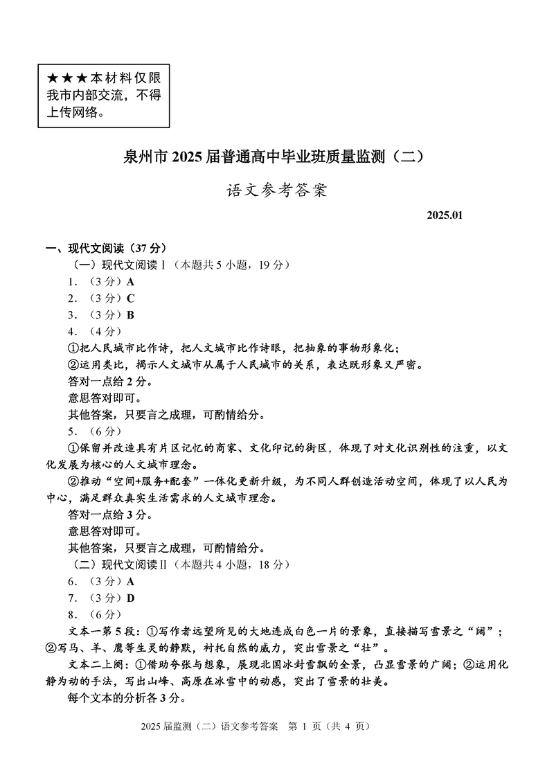 福建泉州2025届高中毕业班质量监测(二)语文试题及答案