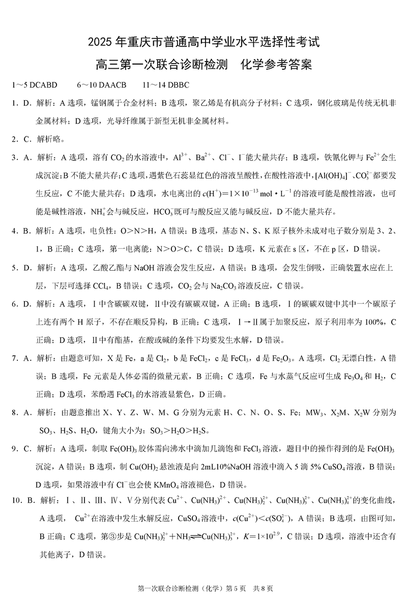 重庆市2025年康德一诊化学试题及答案 时间:2025-01-20 重庆 理综试题 重庆市2025年康德一诊化学考试已于近日开考,为方便考生考后及时查看考试情况,查漏补缺、弥补不足,本文整理了试题答案解析相关信息! 汇总:重庆市2025年康德一诊试题及答案汇总 化学试题及答案解析