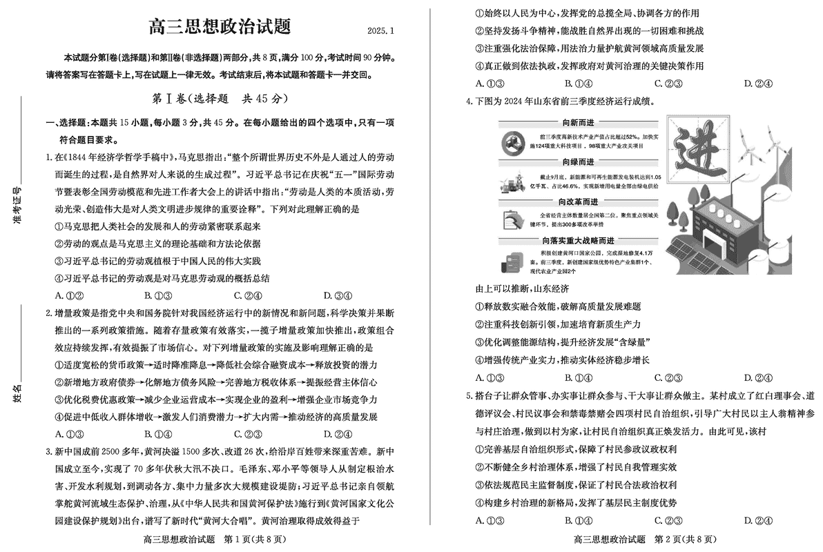 山东德州2025年高三上学期1月期末政治考试已于近日开考,为方便考生考后及时查看考试情况,查漏补缺、弥补不足,本文整理了试题答案解析相关信息!