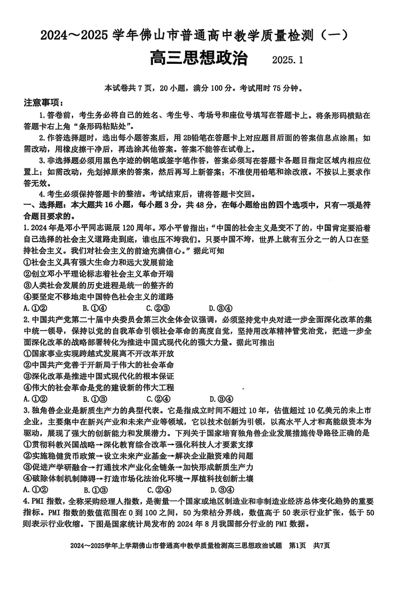 2025届佛山市高三上学期一模政治试题及答案 时间:2025-01-20 广东 文综试题 2025届佛山市高三上学期一模政治考试已于近日开考,为方便考生考后及时查看考试情况,查漏补缺、弥补不足,本文整理了试题答案解析相关信息! 汇总:2025届佛山市高三上学期一模试题及答案汇总 政治试题及答案解析