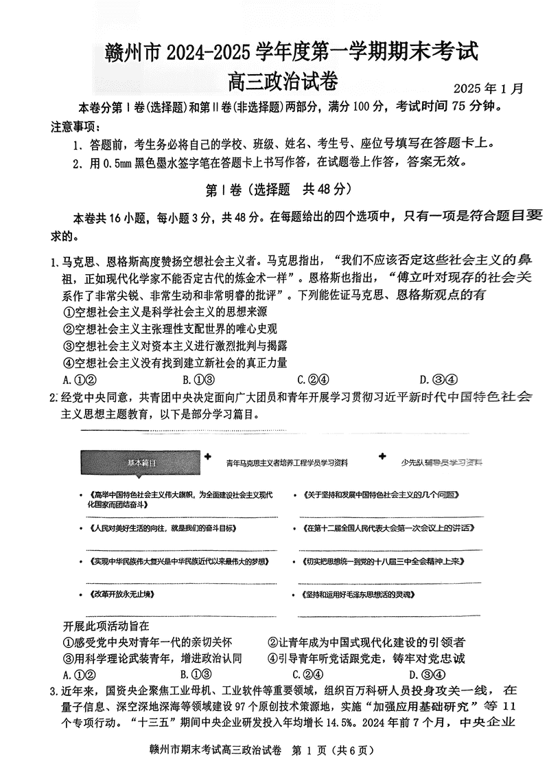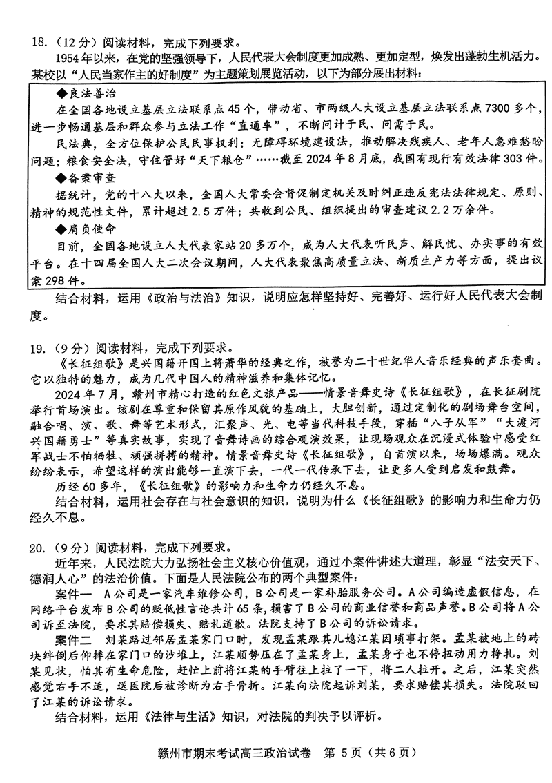 江西赣州2025年1月高三上学期期末政治试题及答案