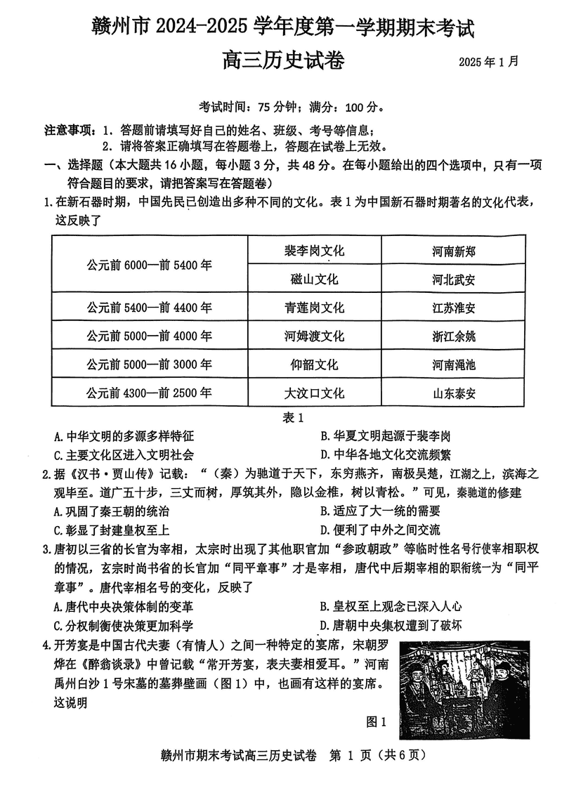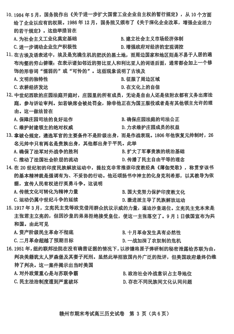 江西赣州2025年1月高三上学期期末历史试题及答案
