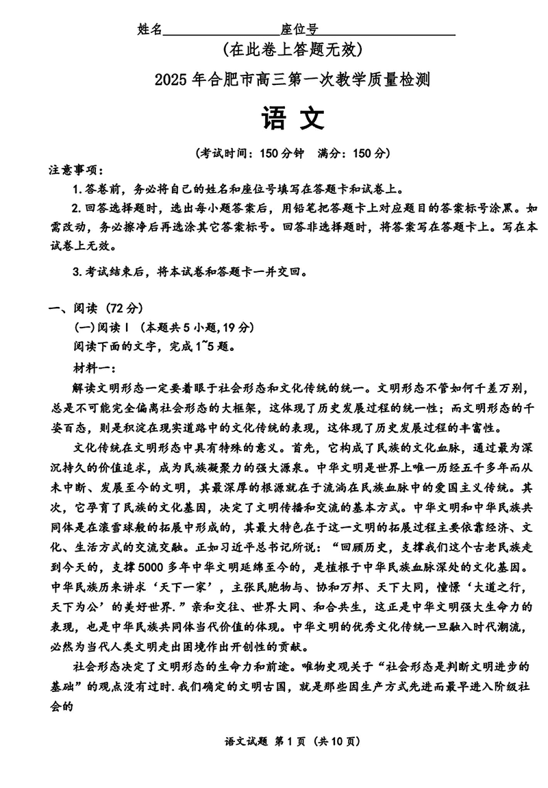 安徽合肥2025届高三第一次教学质检语文考试已于近日开考,为方便考生考后及时查看考试情况,查漏补缺、弥补不足,本文整理了试题答案解析相关信息!