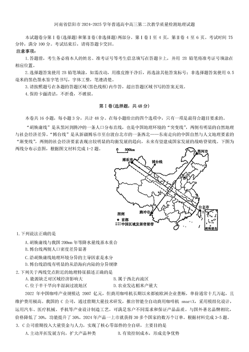 河南信阳2025年高三第二次教学质检地理试题及答案