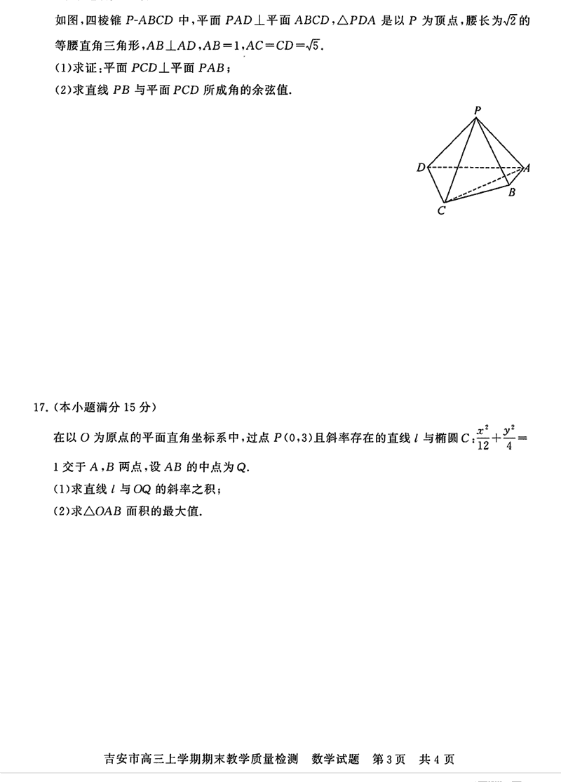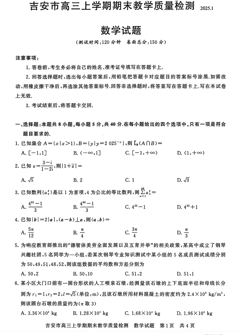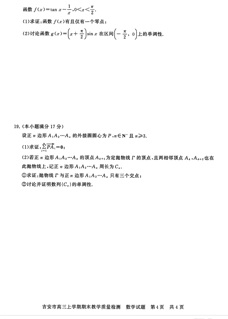 江西吉安2025届高三上1月期末教学质检数学试题及答案