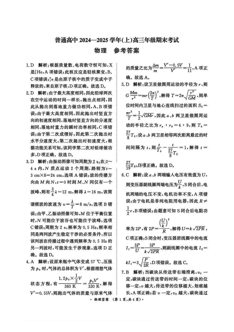 河南青桐鸣大联考2024-2025学年高三上期末物理试题及答案