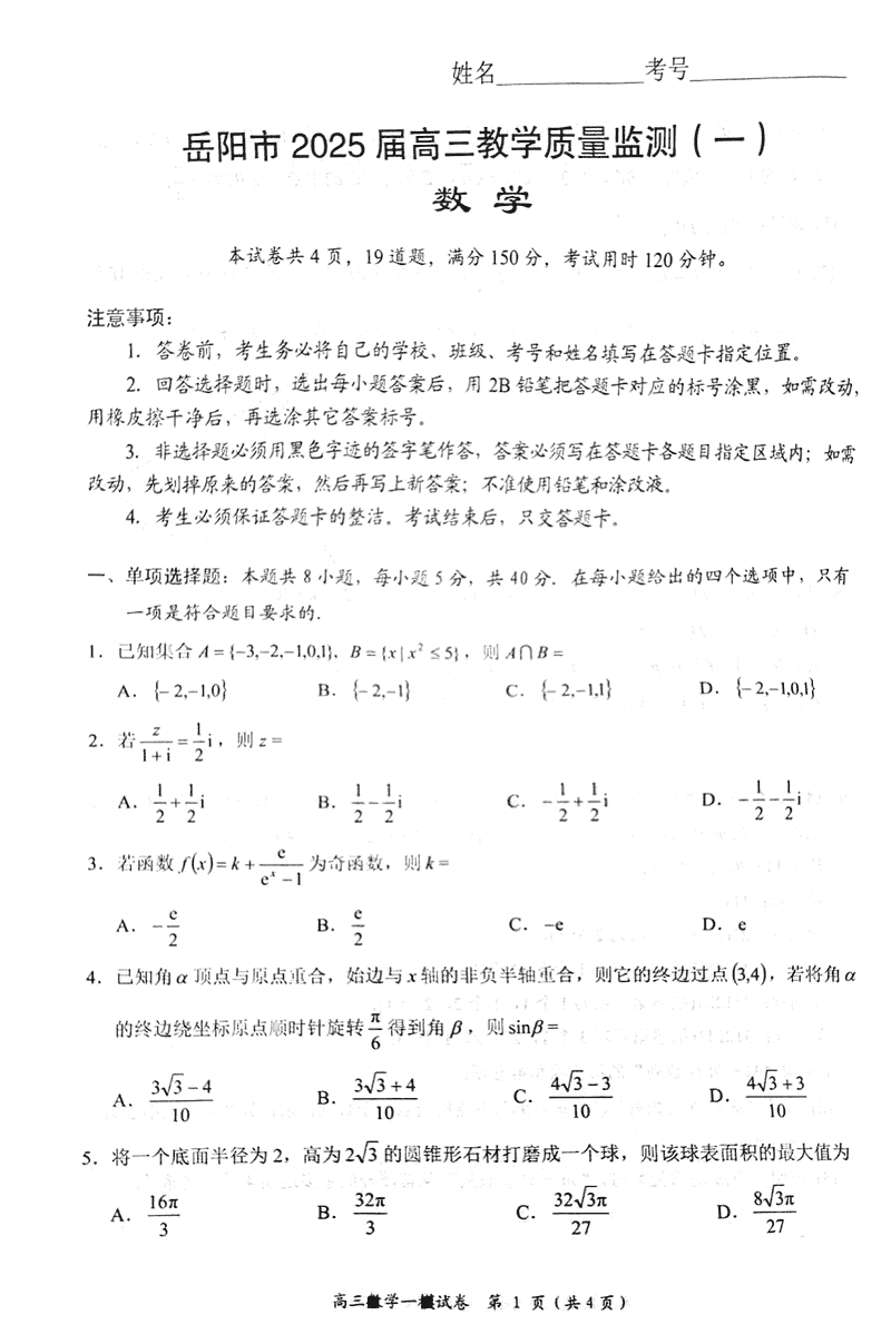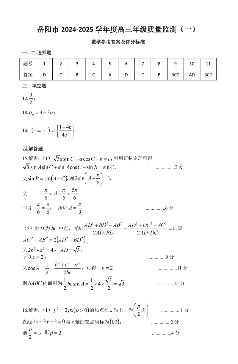 湖南岳阳2025届高三上学期教学质量监测一数学考试已于近日开考,为方便考生考后及时查看考试情况,查漏补缺、弥补不足,本文整理了试题答案解析相关信息!