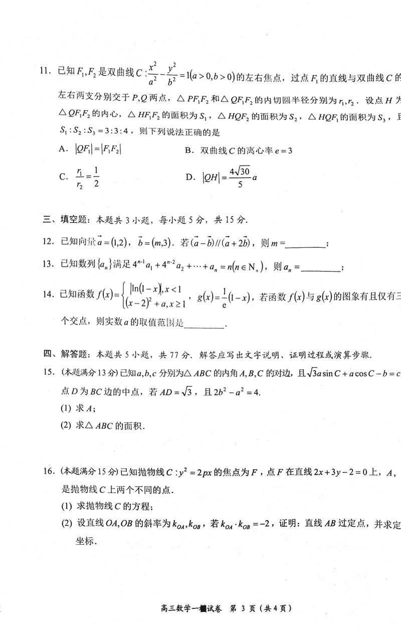 湖南岳阳2025届高三上学期教学质量监测一数学试题及答案