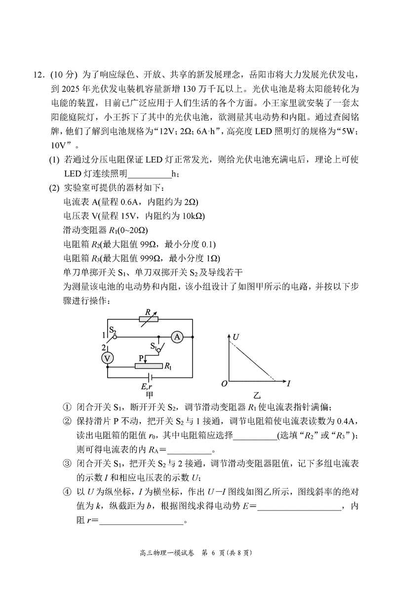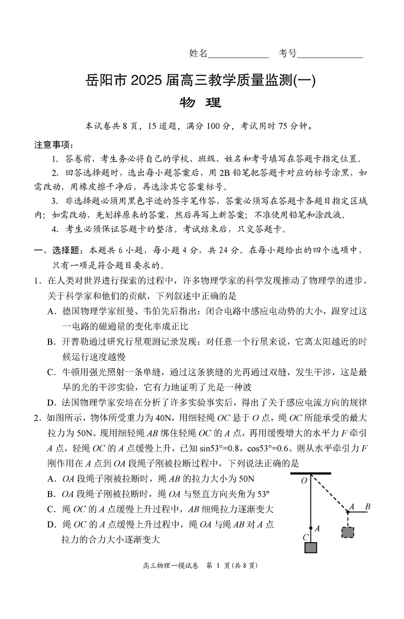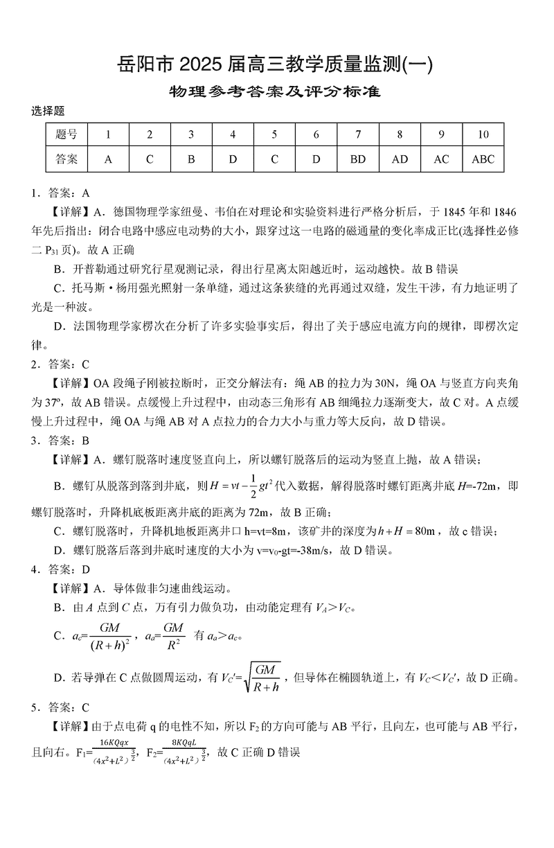 湖南岳阳2025届高三上学期教学质量监测一物理考试已于近日开考,为方便考生考后及时查看考试情况,查漏补缺、弥补不足,本文整理了试题答案解析相关信息!