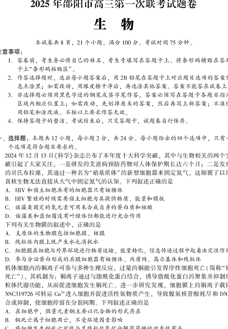 湖南邵阳2025年高三上学期期末生物试题及答案