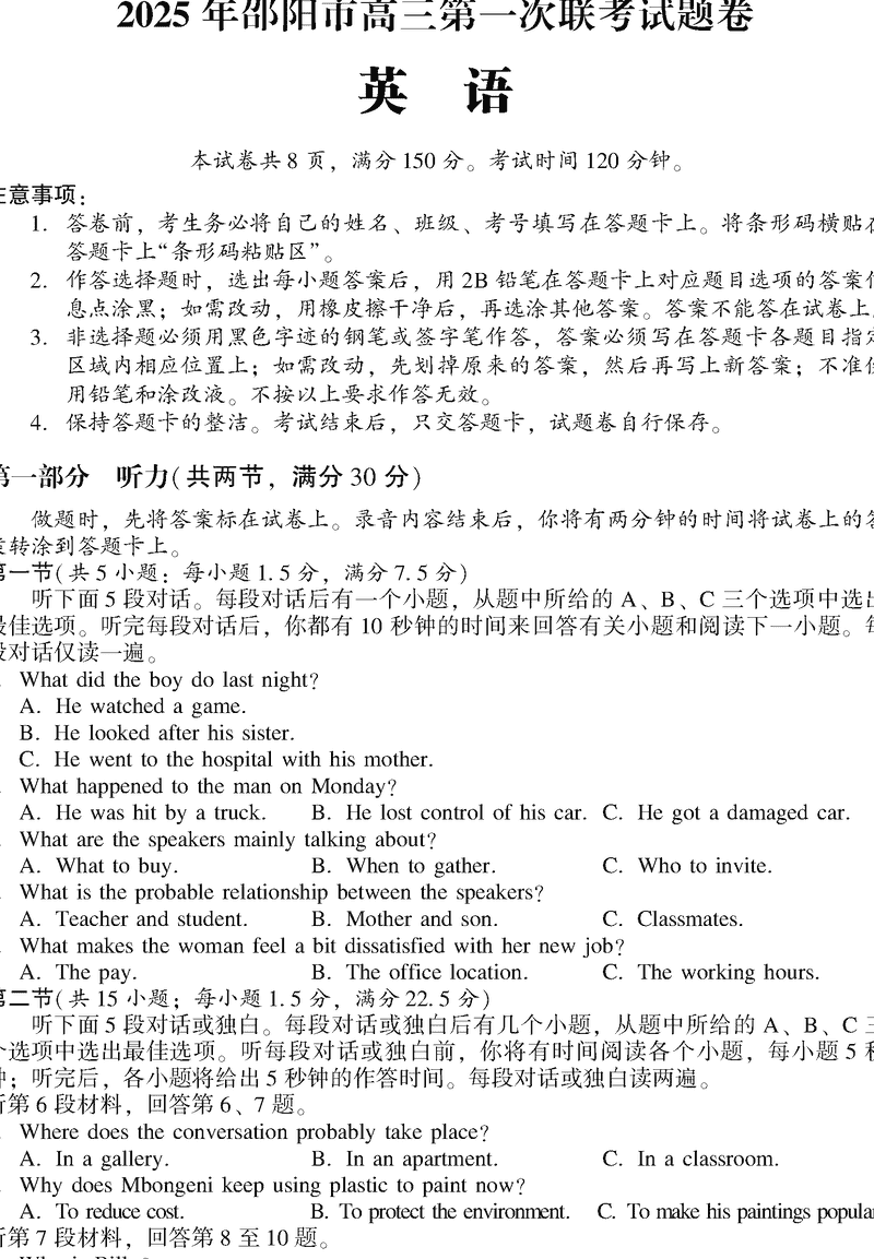 湖南邵阳2025年高三上学期期末英语考试已于近日开考,为方便考生考后及时查看考试情况,查漏补缺、弥补不足,本文整理了试题答案解析相关信息!
