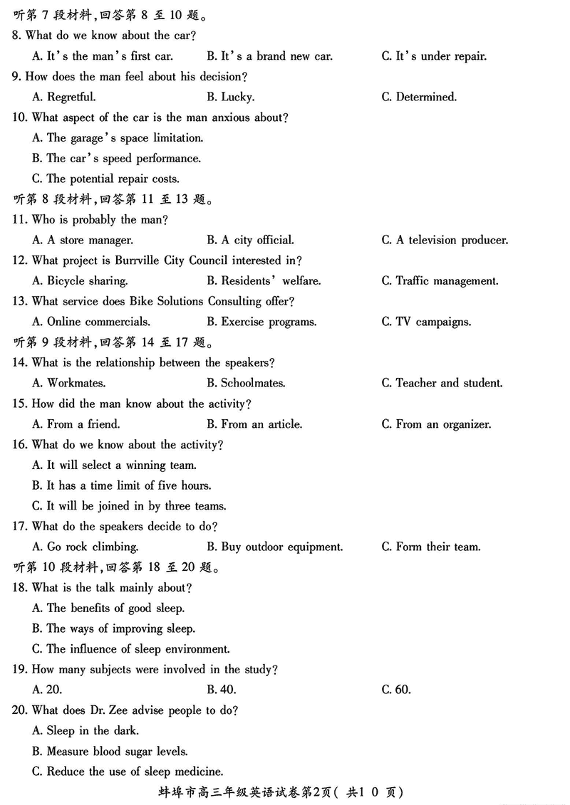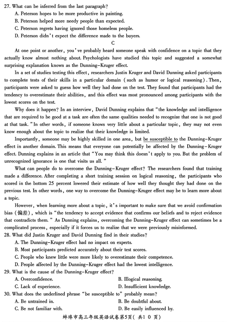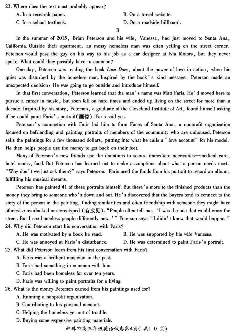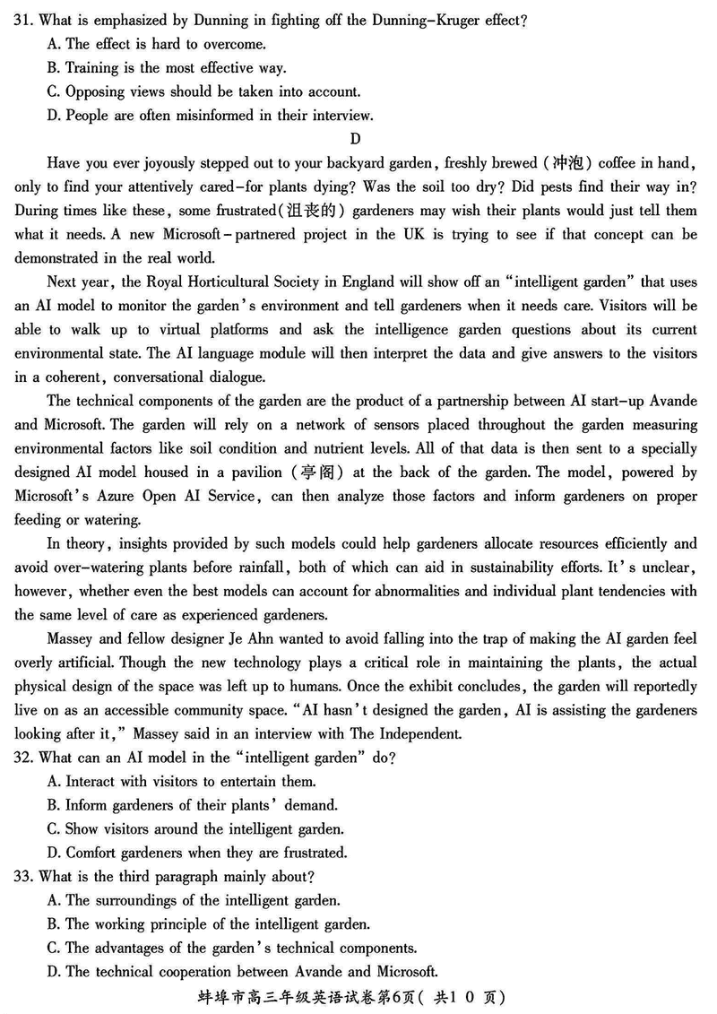 安徽蚌埠2025届高三上学期1月第一次教学质量检查英语试题及答案