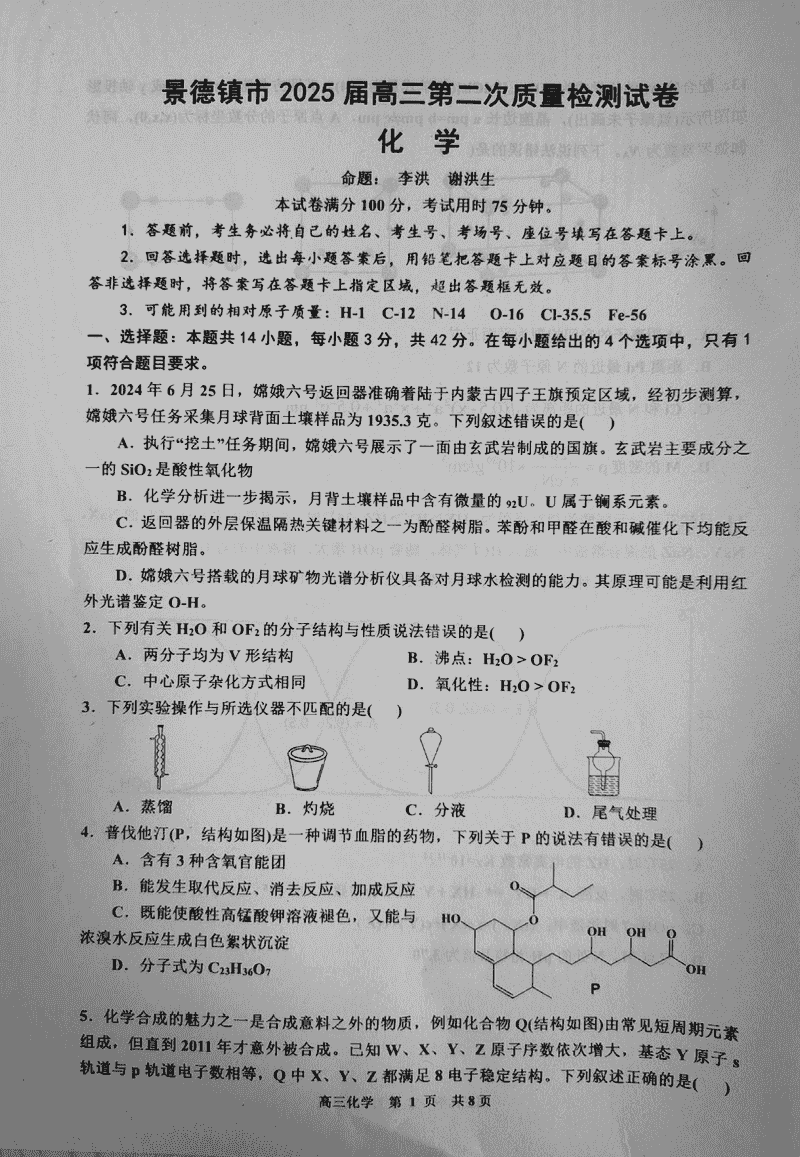 江西景德镇2025届高三上学期第二次质检化学试题及答案