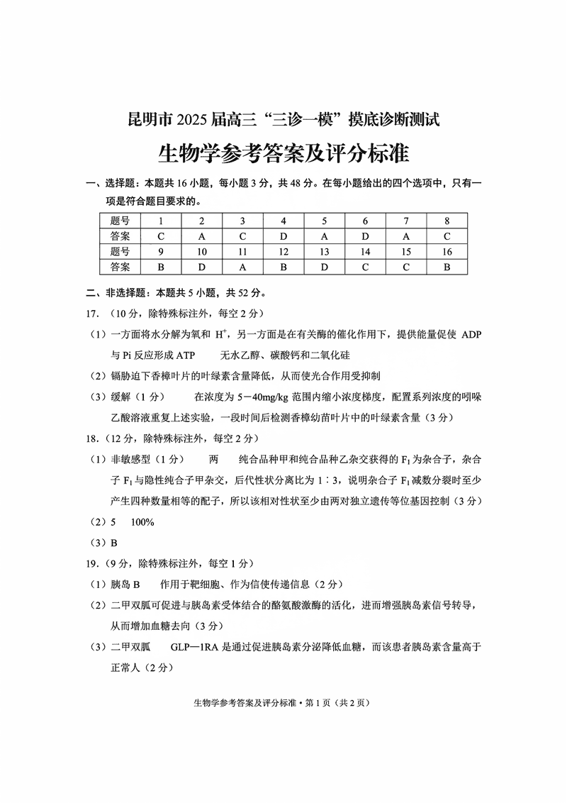 昆明三诊一模2025届高三摸底诊断生物考试已于近日开考,为方便考生考后及时查看考试情况,查漏补缺、弥补不足,本文整理了试题答案解析相关信息!