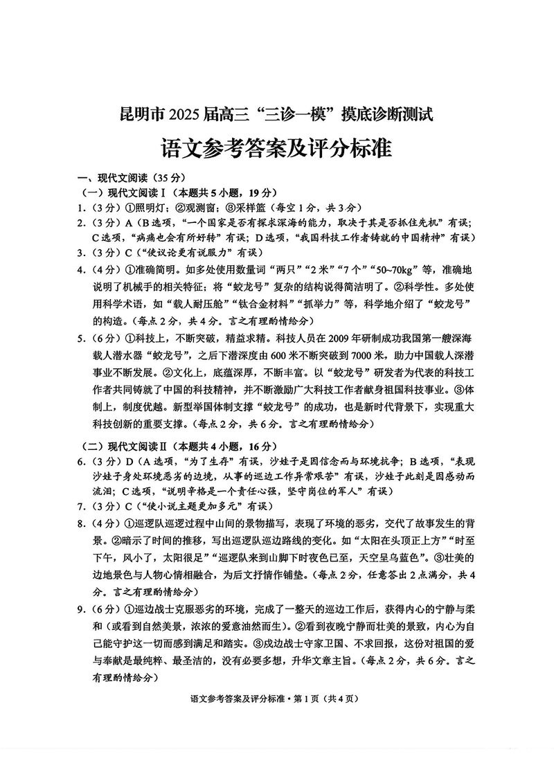 昆明三诊一模2025届高三摸底诊断语文试题及答案