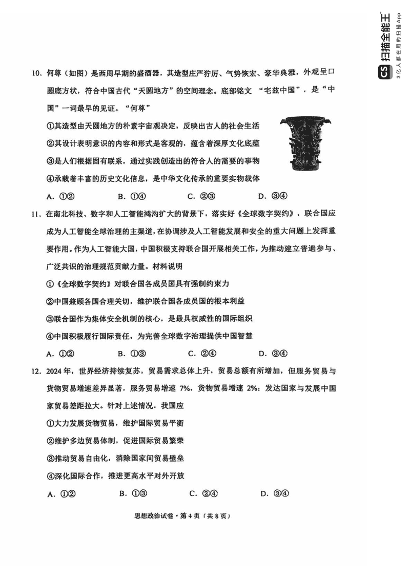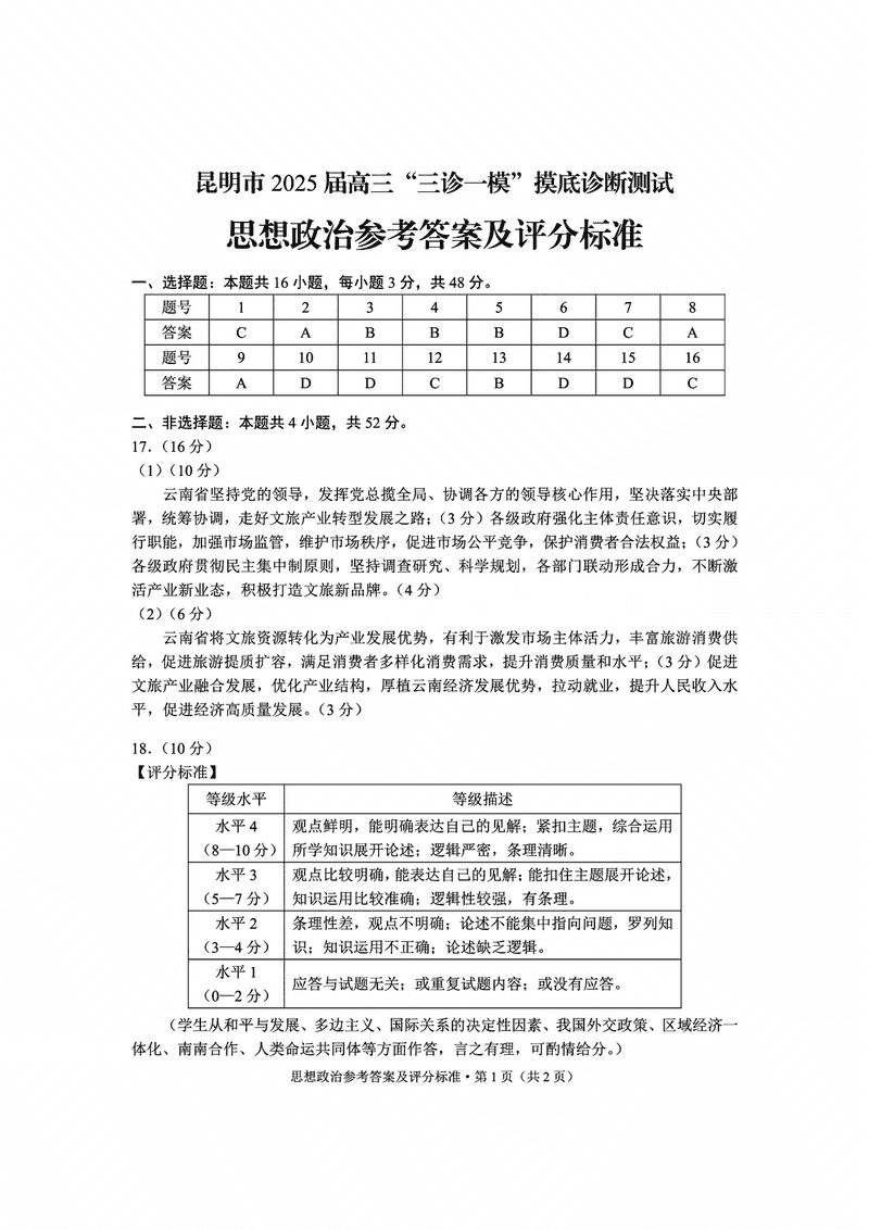 昆明三诊一模2025届高三摸底诊断政治试题及答案