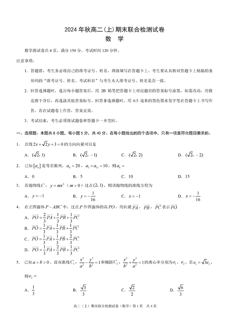 重庆康德2024年秋高二上学期期末数学试题及答案 时间:2025-01-27 重庆 高中数学 重庆康德2024年秋高二上学期期末数学考试已于近日开考,为方便考生考后及时查看考试情况,查漏补缺、弥补不足,本文整理了试题答案解析相关信息! 数学试题及答案解析